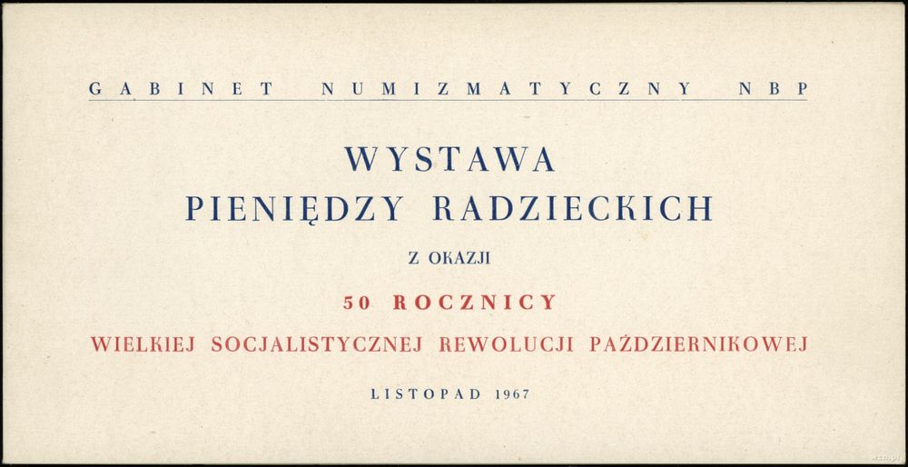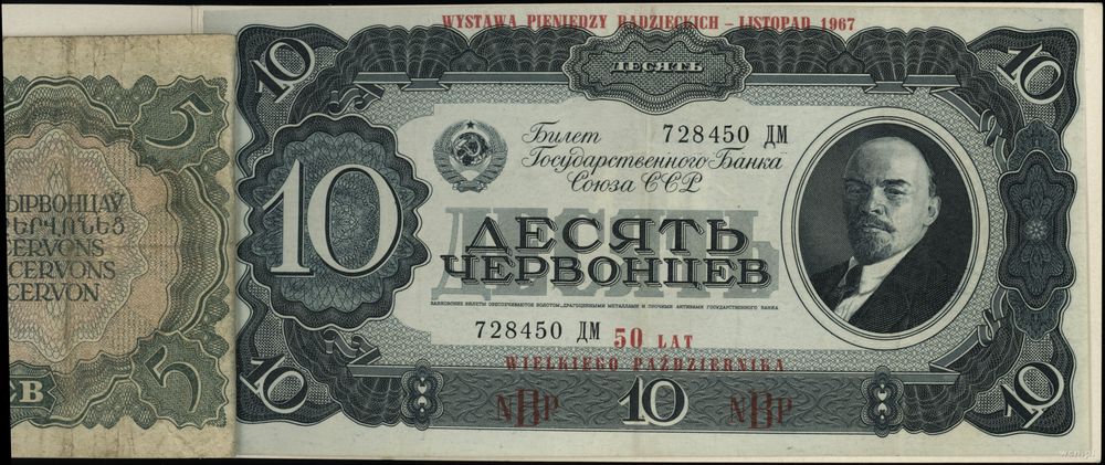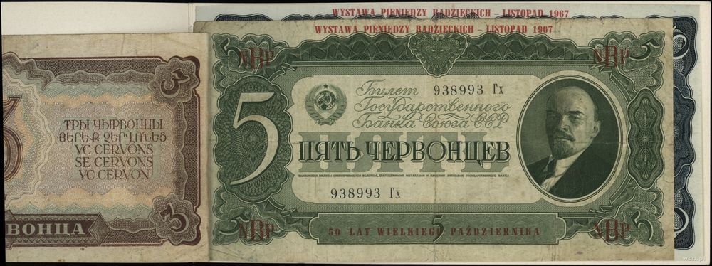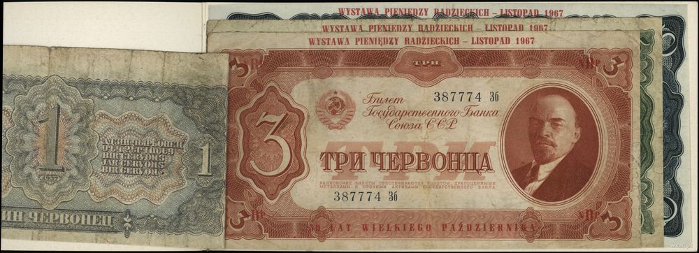 | Opis: | Polska - Polska Rzeczpospolita Ludowa (1952–1989), komplet banknotów rosyjskich z 1937, z Wystawy Pieniedzy Radzieckich z 1967 organizowanych przez NBP, na banknotach okolicznościowy nadruk WYSTAWA PIENIĘDZY RADZIECKICH - LISTOPAD 1967 / 50 LAT WIELKIEGO PAŹDZIERNIKA, nominały: 1, 3, 5, 10 czerwońców |