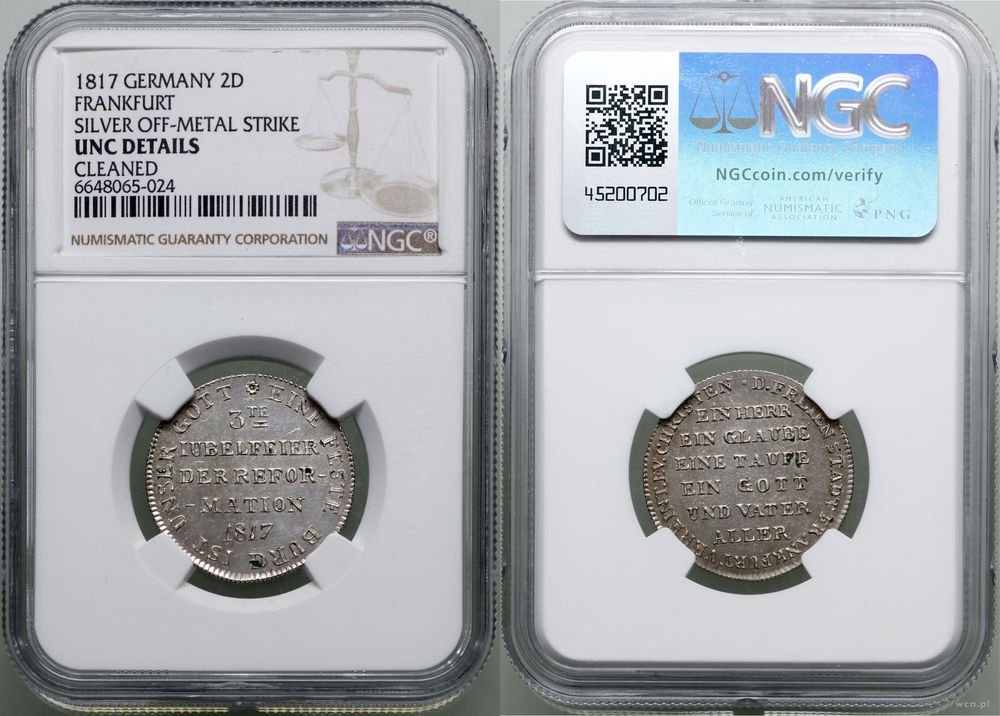 | Opis: | Niemcy - Frankfurt – miasto, odbitka dukata w srebrze, 1817, z okazji 300. lecia Reformacji; Aw: 3TE / JUBELFEIER / DER REFOR / MATION / 1817., EINE FESTE BURG IST UNSER GOTT, Rw: EIN HERR / EIN GLAUBE / EINE TAUFE / EIN GOTT / UND VATER / ALLER, D. FREIEN STADT FRANKFURT VEREINT EV CHRISTEN |