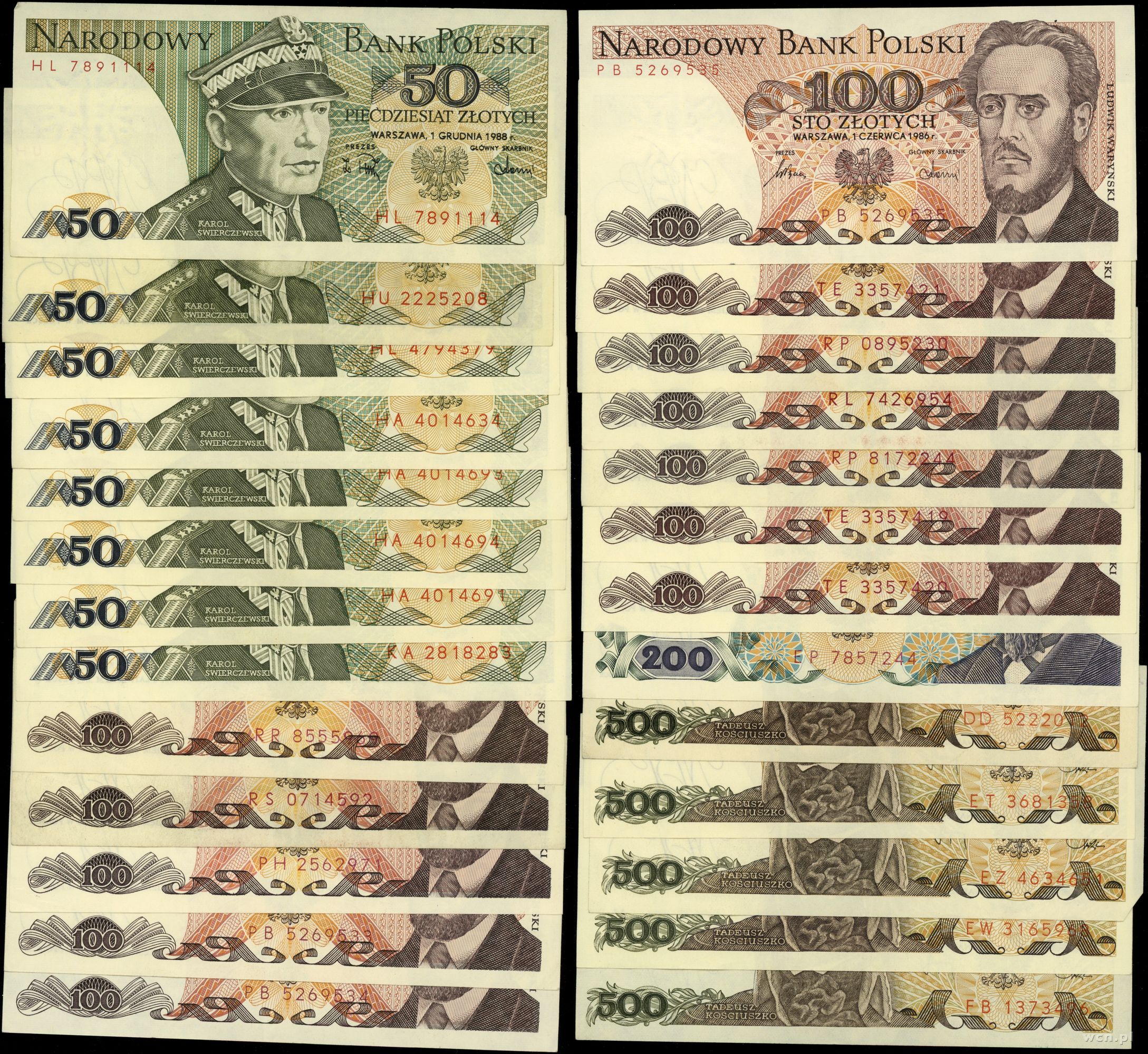 1) 8 x 50 złotych 1988 kilka serii 2) 5 x 100 złotych 198... | II+/III+ |