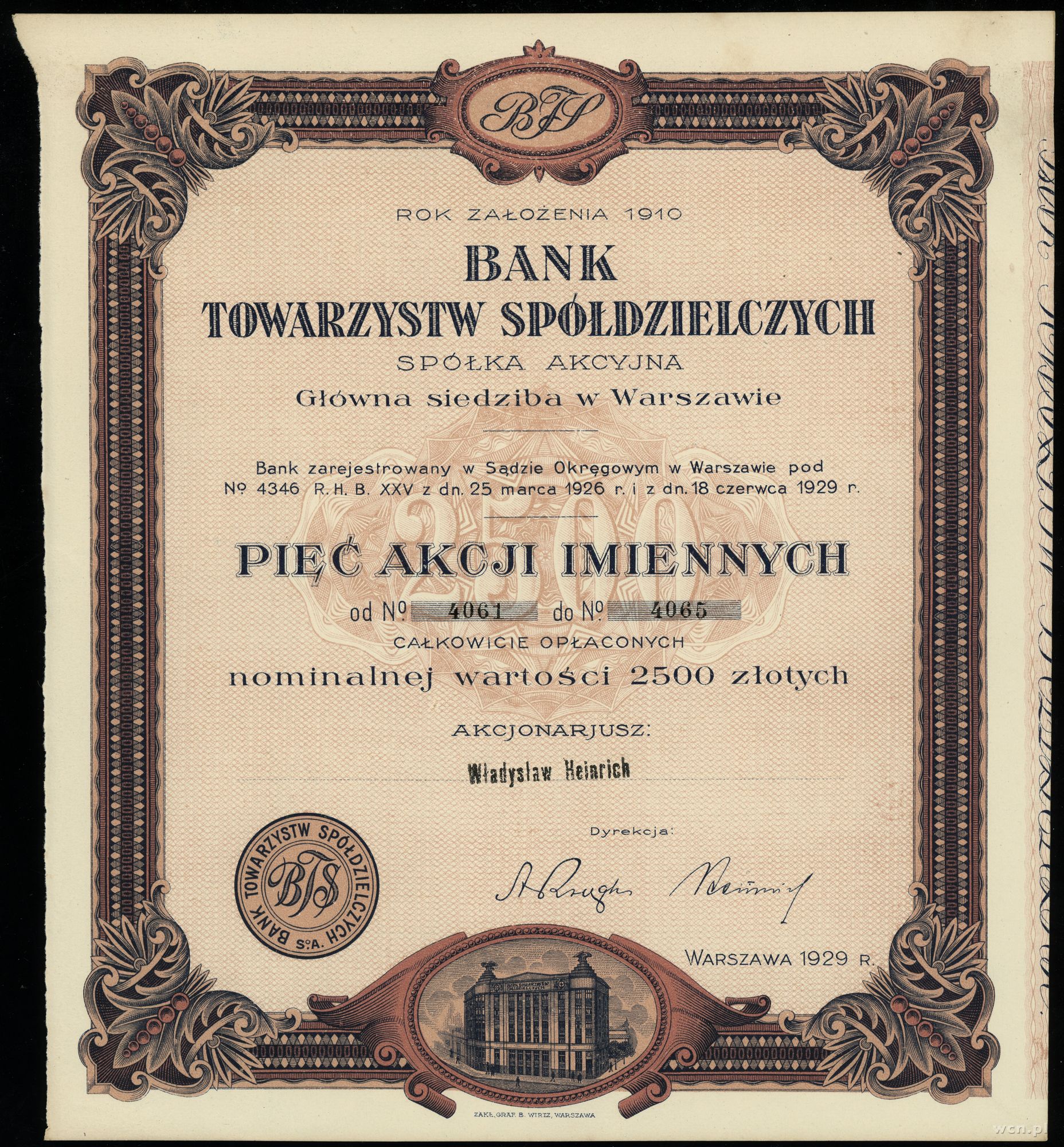numeracja 0037, akcja wystawiana na Pana Władysława Heinr... | I/I- |