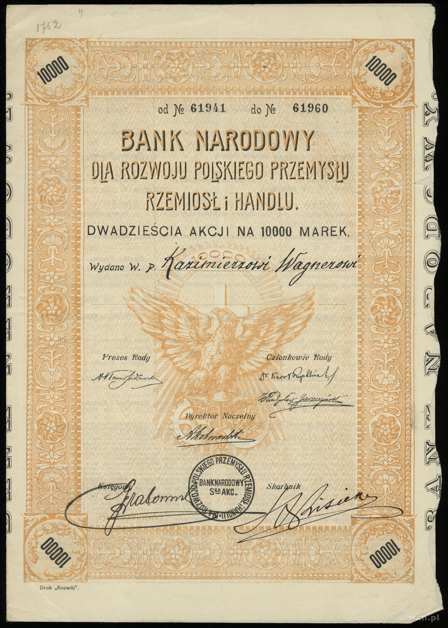 I emisja, numeracja od 61941 do 61960, wydane dla pana Ka... | III |