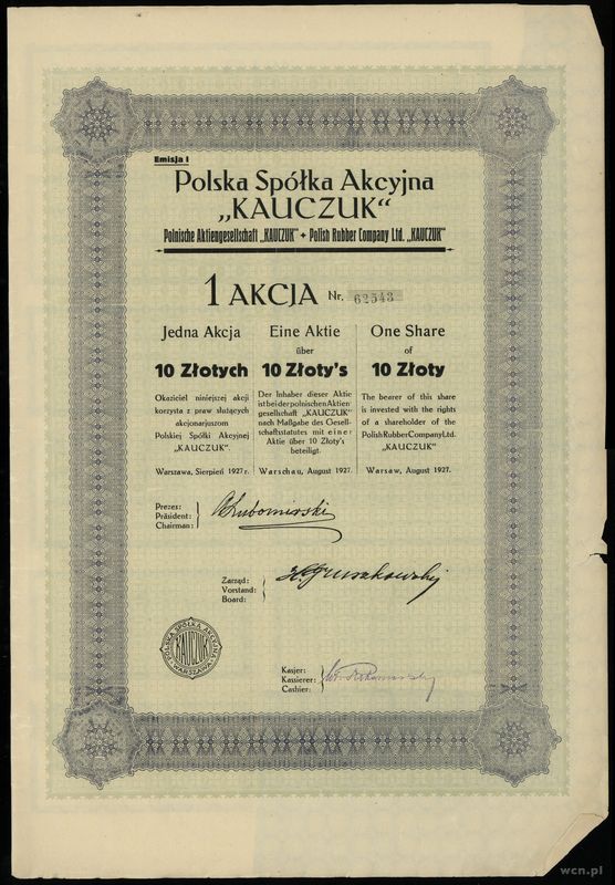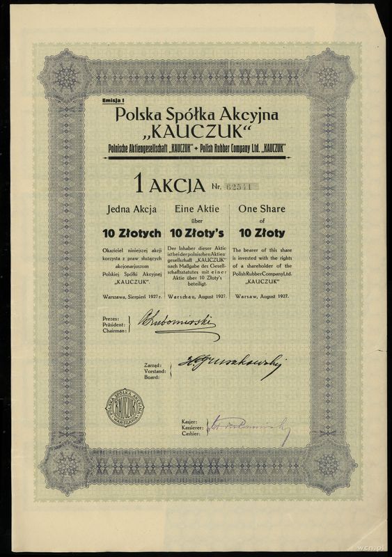 | Opis: | Polska - Polska Spółka Akcyjna “KAUCZUK”, zestaw: 5 x 1 akcja na 10 złotych, sierpień 1927, numeracja między 62540 a 62544, akcje z kuponami |