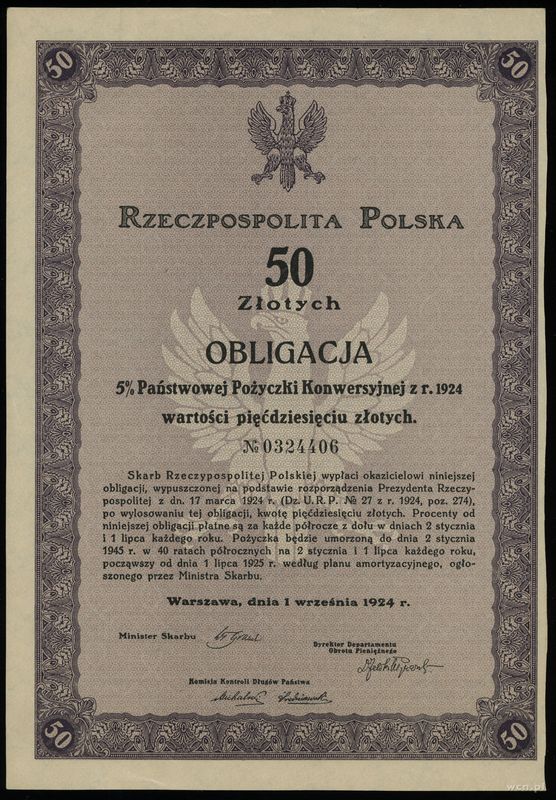 | Opis: | Rzeczpospolita Polska (1918–1939) - Państwowa Pożyczka Konwersyjna, zestaw 3 obligacji, 1.09.1924, 1) 2 x 5 % Państwowa Pożyczka Konwersyjna wartości 10 złotych 2) 1 x 5 % Państwowa Pożyczka Konwersyjna wartości 50 złotych |