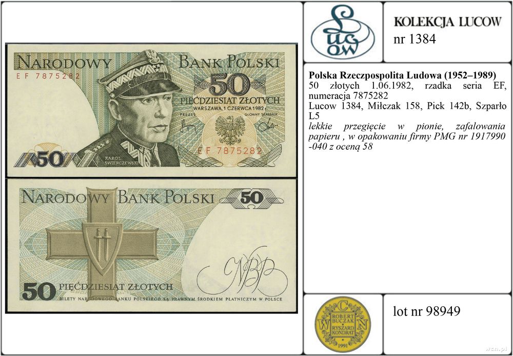 | Opis: | Polska - Polska Rzeczpospolita Ludowa (1952–1989), 50 złotych, 1.06.1982, rzadka seria EF, numeracja 7875282 |