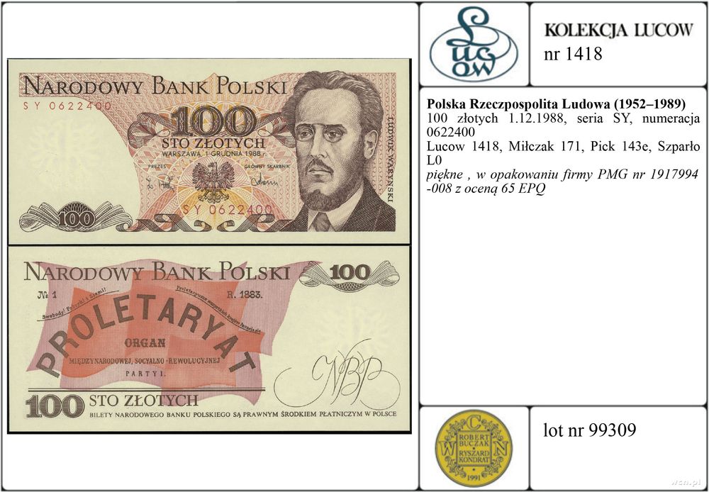 | Opis: | Polska - Polska Rzeczpospolita Ludowa (1952–1989), 100 złotych, 1.12.1988, seria SY, numeracja 0622400 |