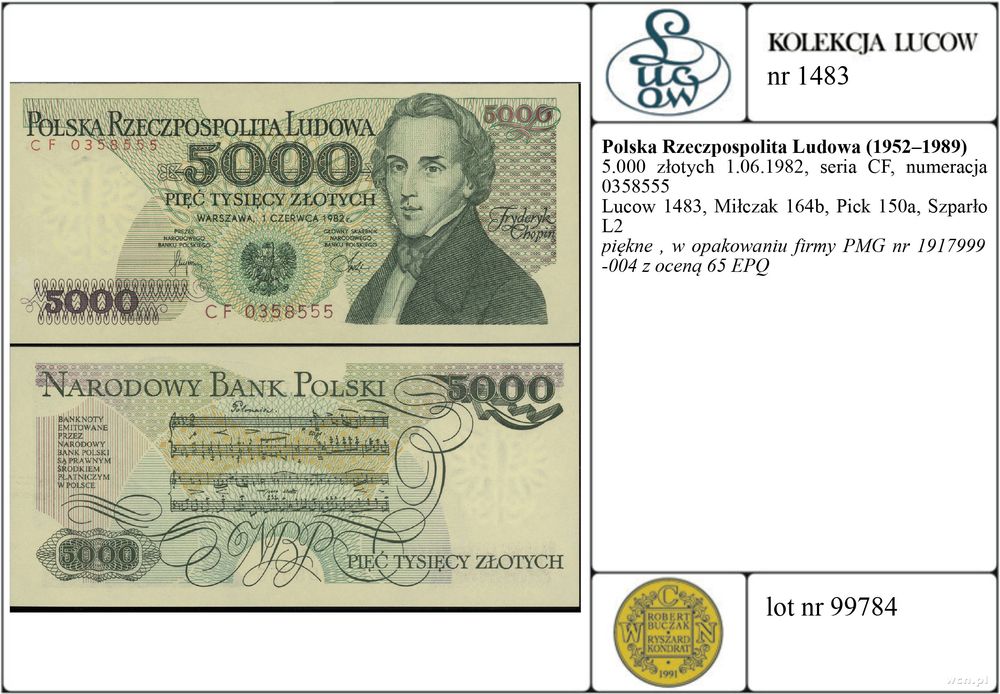 | Opis: | Polska - Polska Rzeczpospolita Ludowa (1952–1989), 5.000 złotych, 1.06.1982, seria CF, numeracja 0358555 |