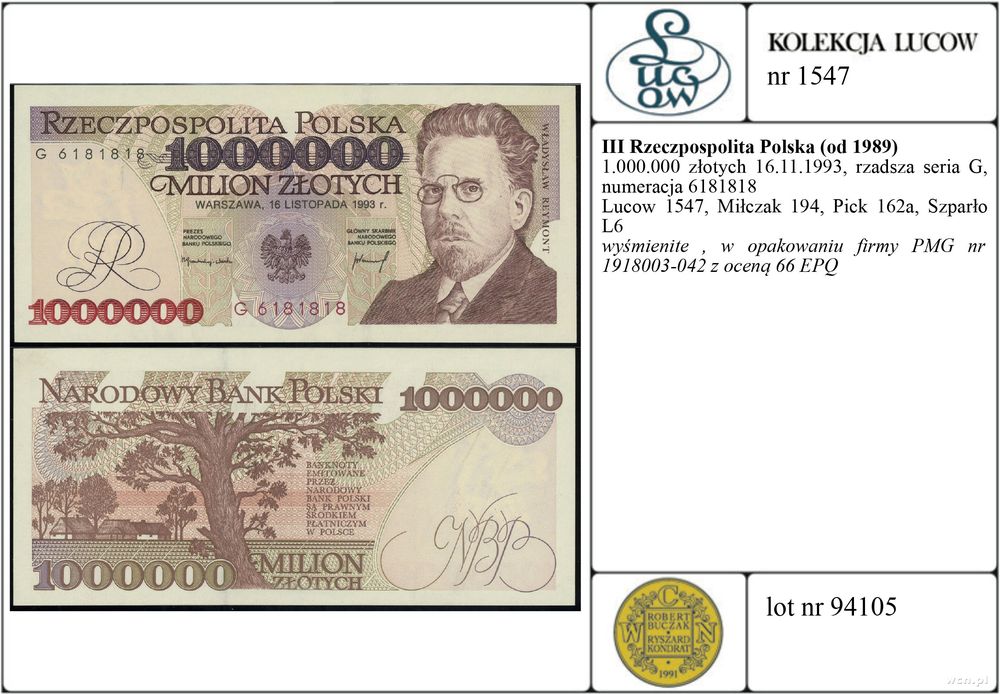 | Opis: | Polska - III Rzeczpospolita Polska (od 1989), 1.000.000 złotych, 16.11.1993, rzadsza seria G, numeracja 6181818 |