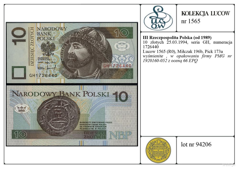 | Opis: | Polska - III Rzeczpospolita Polska (od 1989), 10 złotych, 25.03.1994, seria GH, numeracja 1726440 |