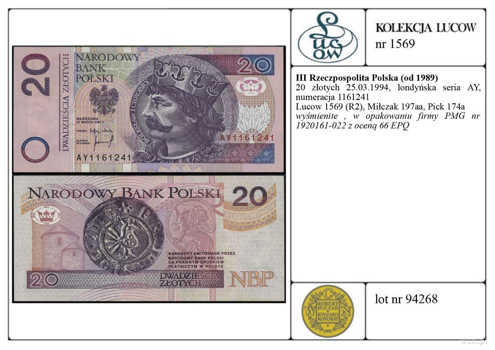 | Opis: | Polska - III Rzeczpospolita Polska (od 1989), 20 złotych, 25.03.1994, londyńska seria AY, numeracja 1161241 |
