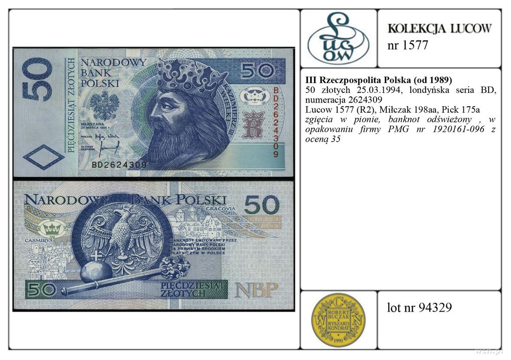 | Opis: | Polska - III Rzeczpospolita Polska (od 1989), 50 złotych, 25.03.1994, londyńska seria BD, numeracja 2624309 |