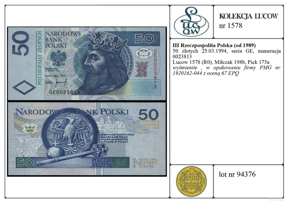| Opis: | Polska - III Rzeczpospolita Polska (od 1989), 50 złotych, 25.03.1994, seria GE, numeracja 0023813 |
