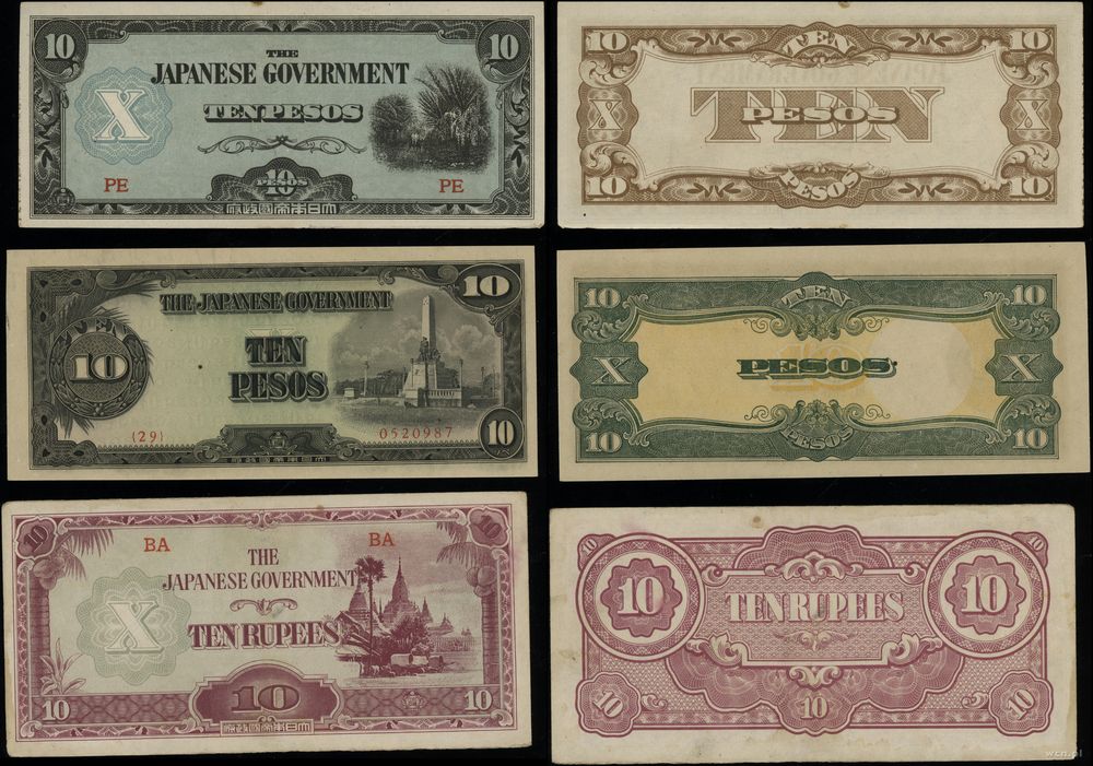 | Opis: | Filipiny - The Japanese Government, zestaw 6 banknotów, 1942–1944, nominały: 1 peso, 5 peso, 10 peso, 10 peso, 1 dolar (Malezja), 10 rupii (Birma) |