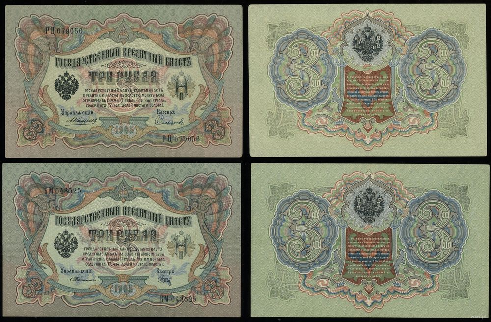 | Opis: | Rosja - Mikołaj II (1894–1917), zestaw 5 banknotów, 1904–1918, 1) 3 ruble (1904–1909) Тимашев (II-) 2) 3 ruble (1910–1914) Коншин (II-) 3) 2 x 10 rubli (1914–1918) Шипов (II) 4) 25 rubli (1914–1918) Шипов (III+) |