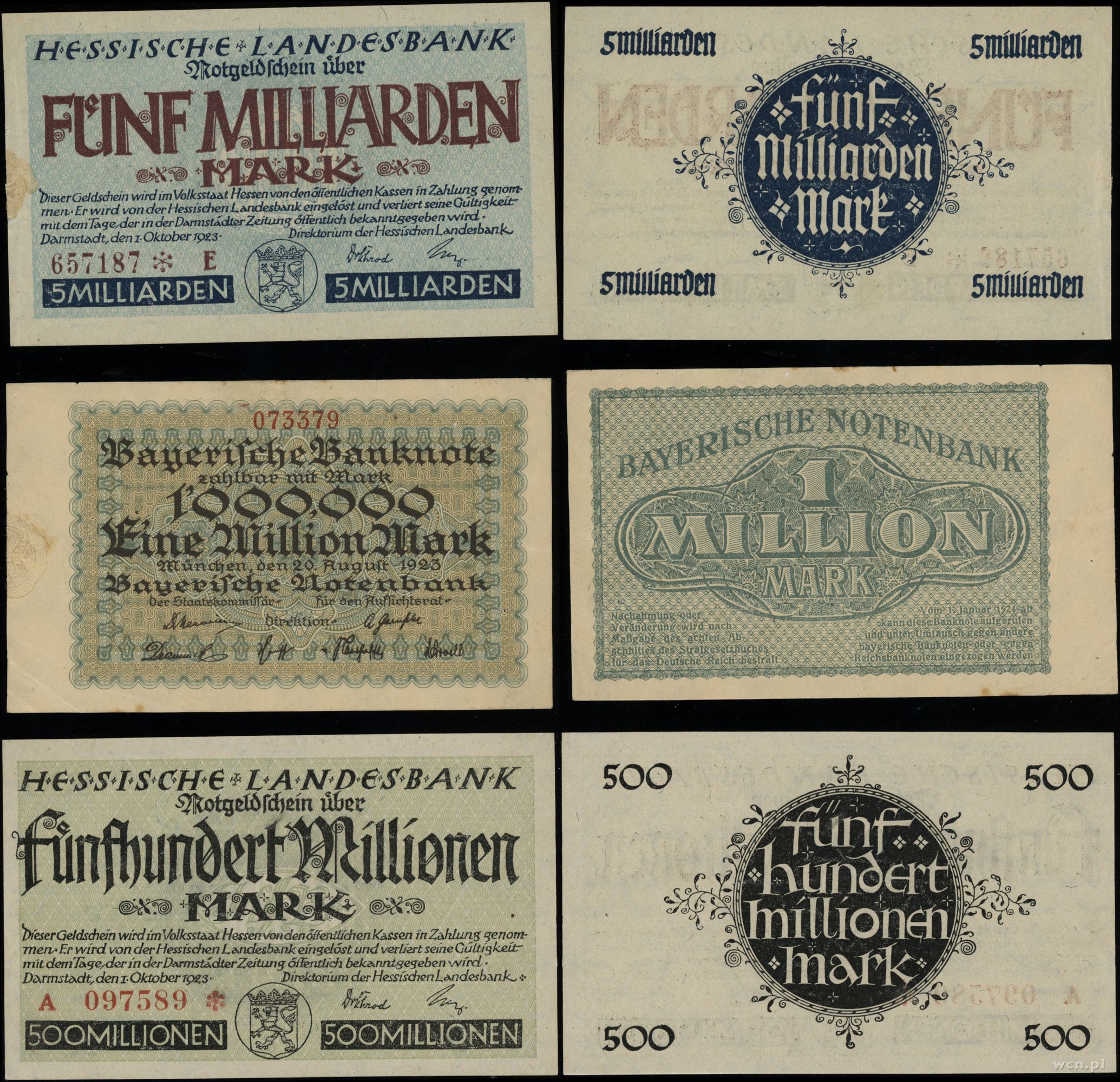 Niemcy, zestaw 6 banknotów, 1923