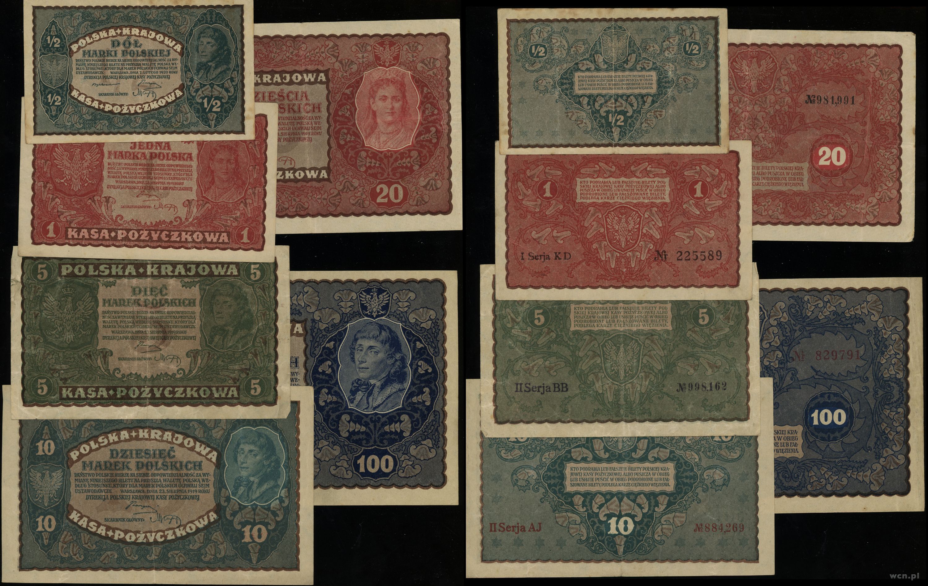 nominały: 1 marka, 5 marek, 10 marek, 100 marek, 500 mare... | II-/IV+ |