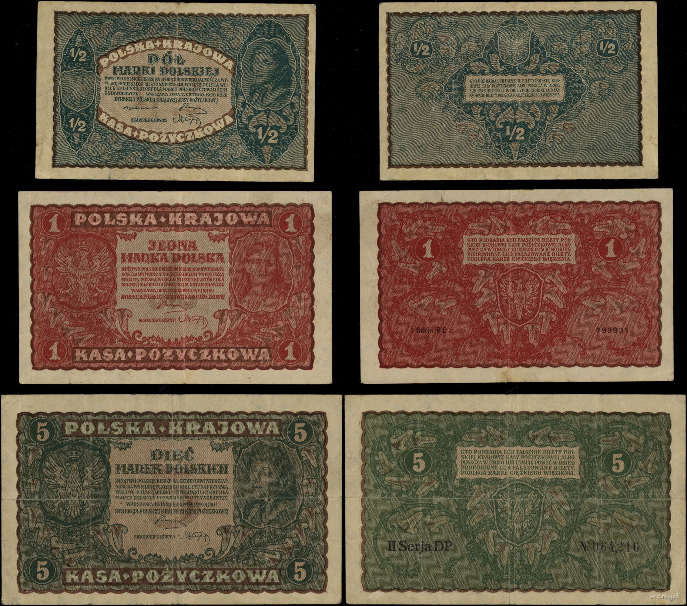 nominały: 1/2 marki polskiej, 1 marka polska I-KD, 5 mare... | II/III |