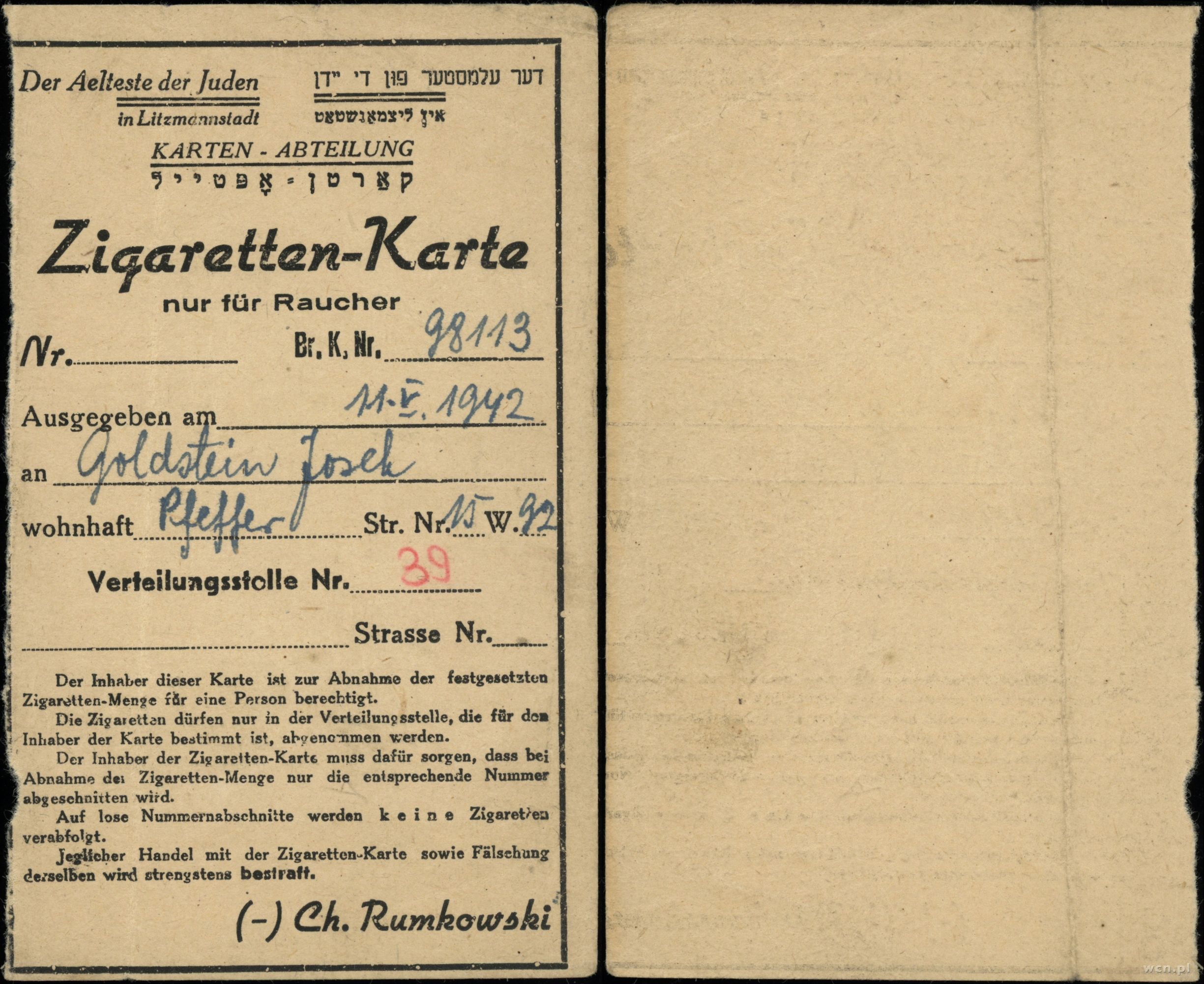 Polska, kartka na papierosy wystawiona dla Joska Goldstein'a, 1942