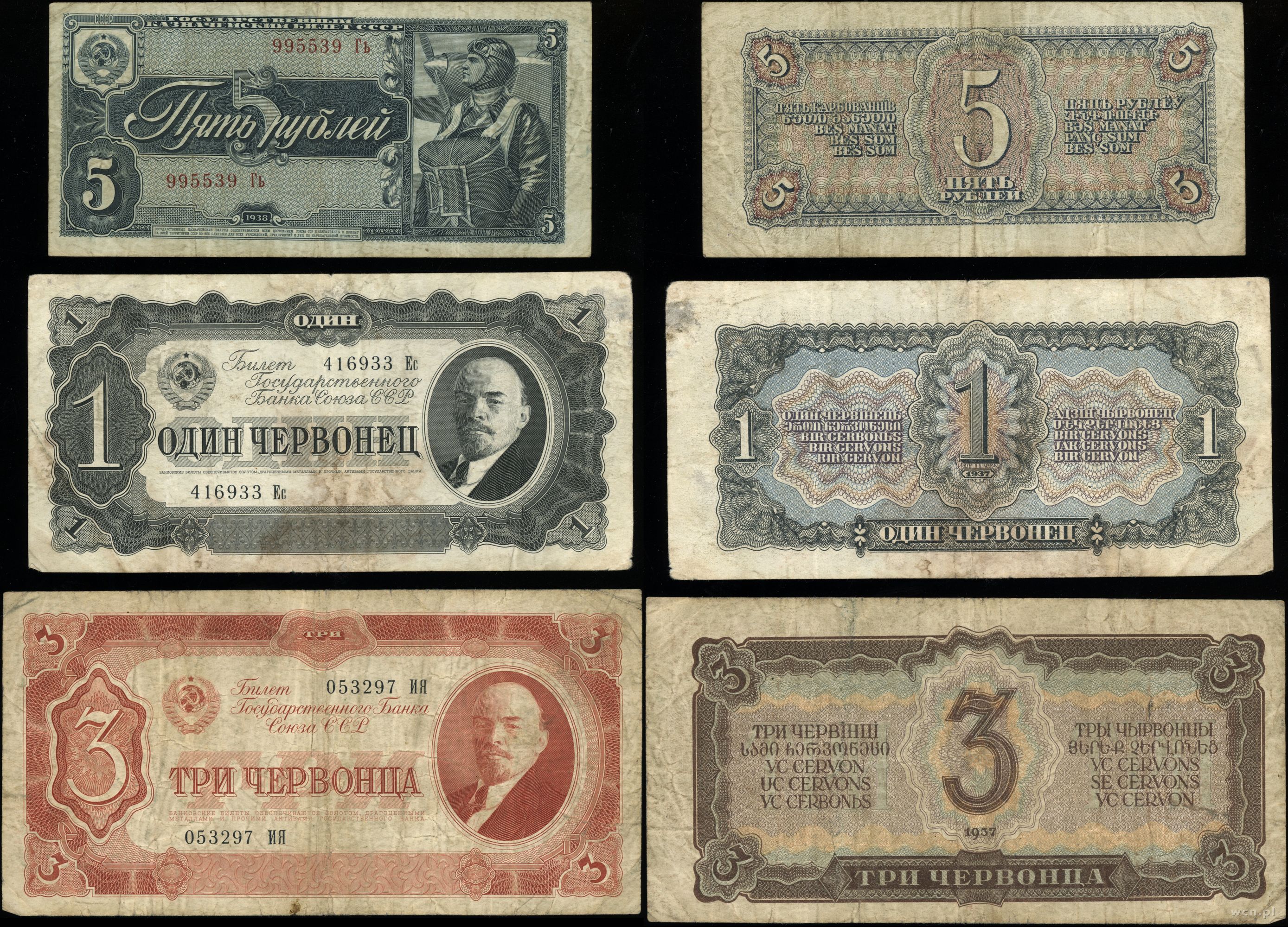 nominały: 1, 3, 5 czerwońców 1937, 5 rubli 1938, 50 rubli... | III/IV |