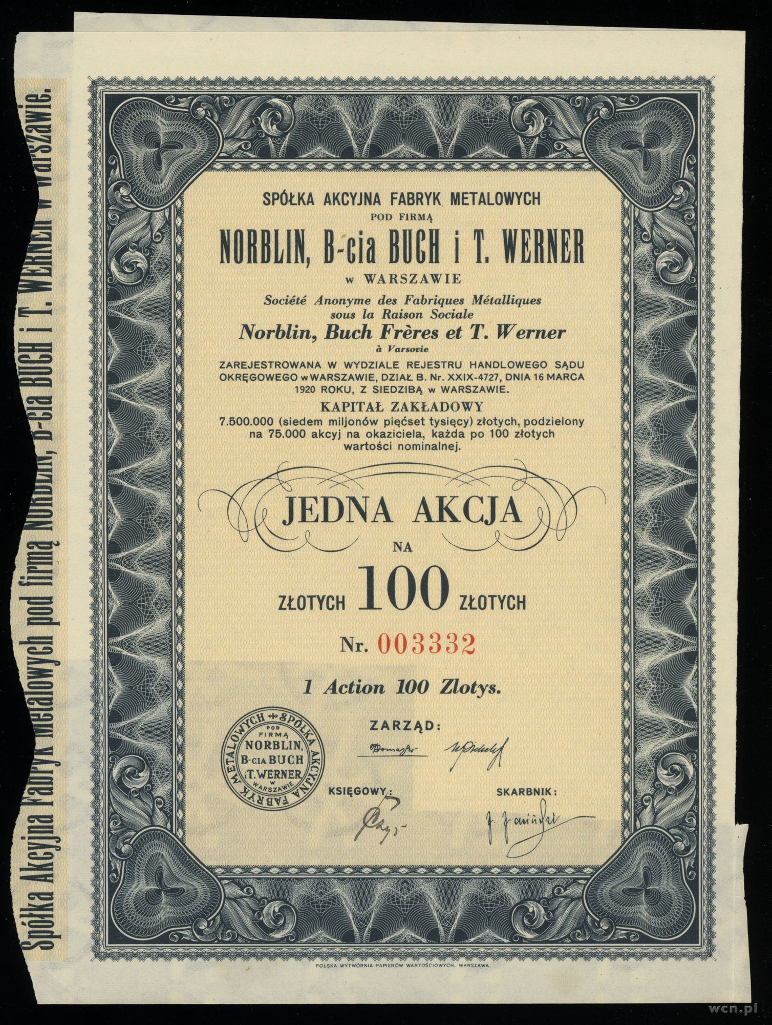 1) 1 akcja na 100 złotych [Norblin, B-cia Buch i T. Werne... | I-/III |