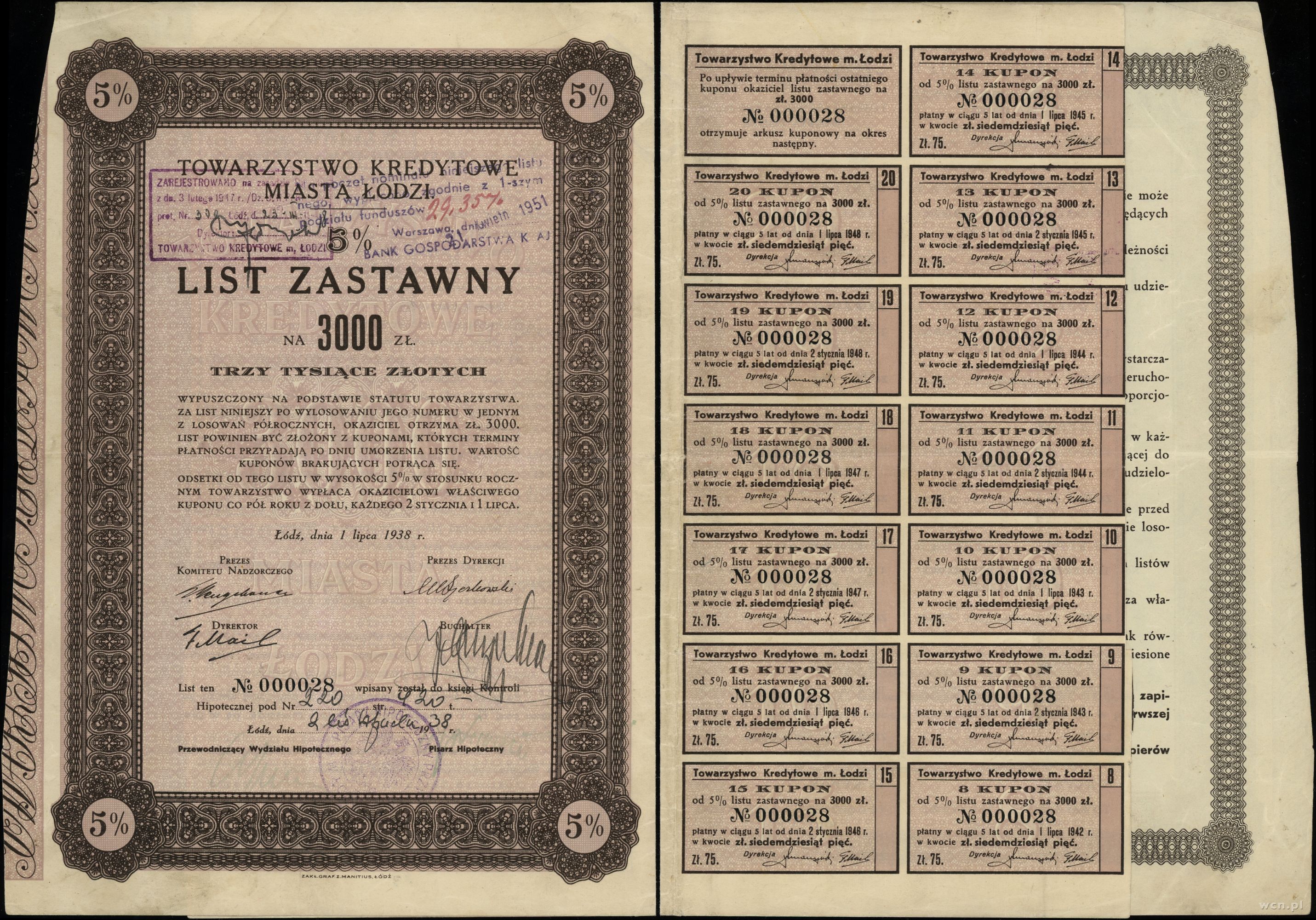Polska, 5% list zastawny na 3.000 złotych, 1.07.1938