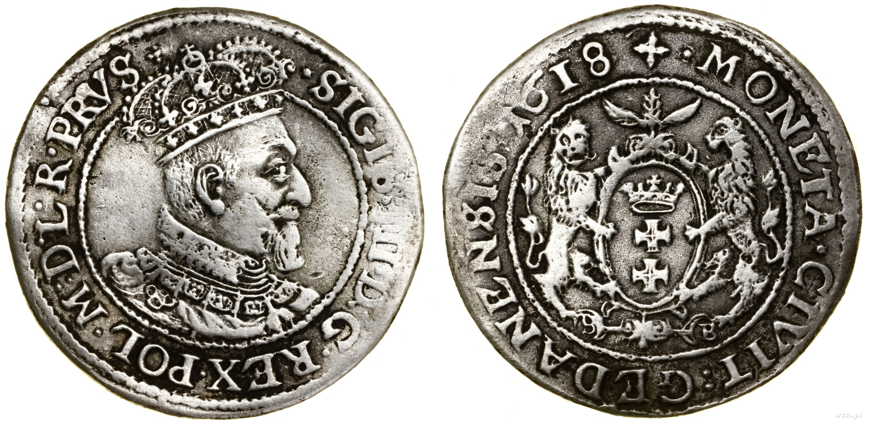 | Opis: | Polska - Zygmunt III Waza (1587–1632) - miasto Gdańsk, ort, 1618, Gdańsk, odmiana z krzyżem w legendzie rewersu |