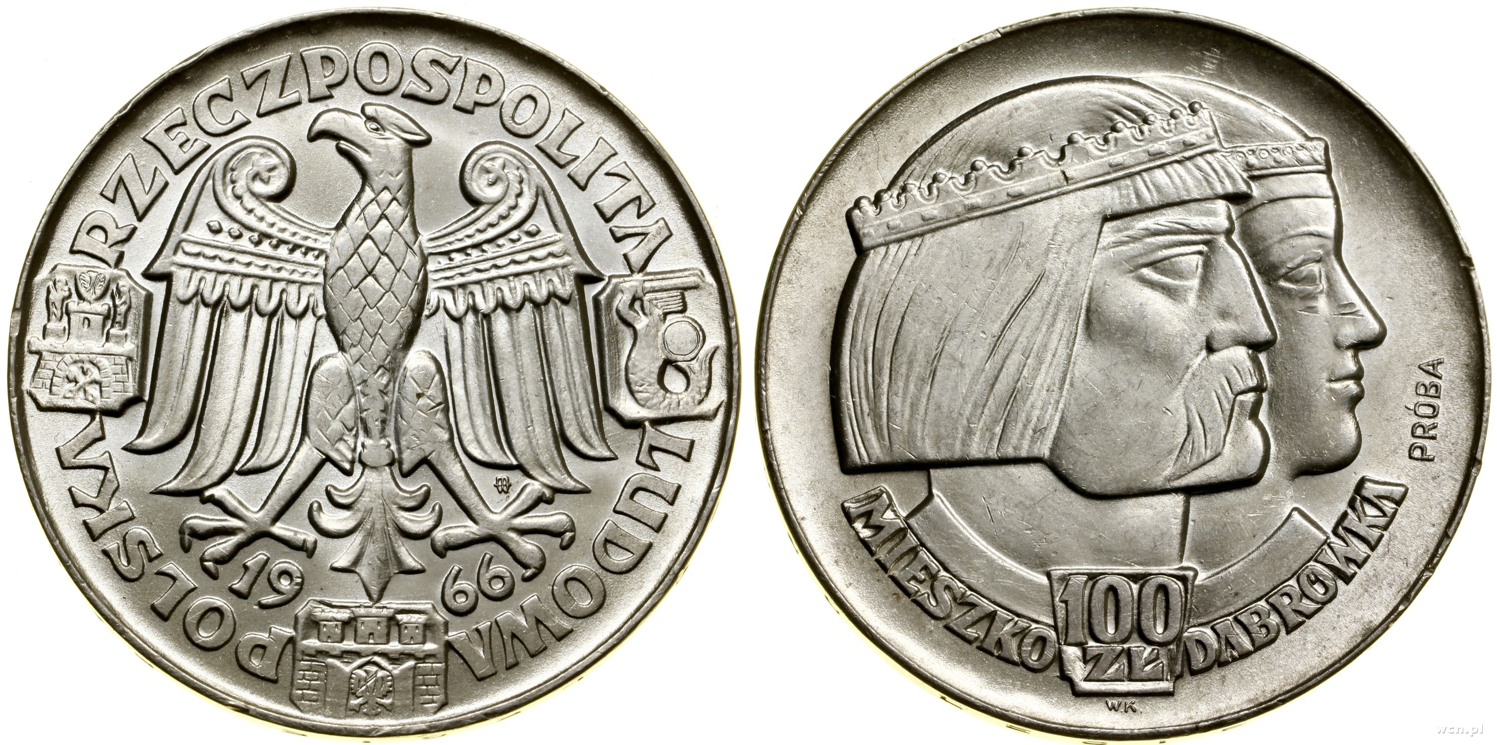 | Opis: | Polska - Polska Rzeczpospolita Ludowa (1952–1989) - monety próbne, 100 złotych, 1966, Warszawa, Tysiąclecie Państwa Polskiego – Mieszko i Dąbrówka (głowy w prawo), wypukły napis PRÓBA na rewersie |