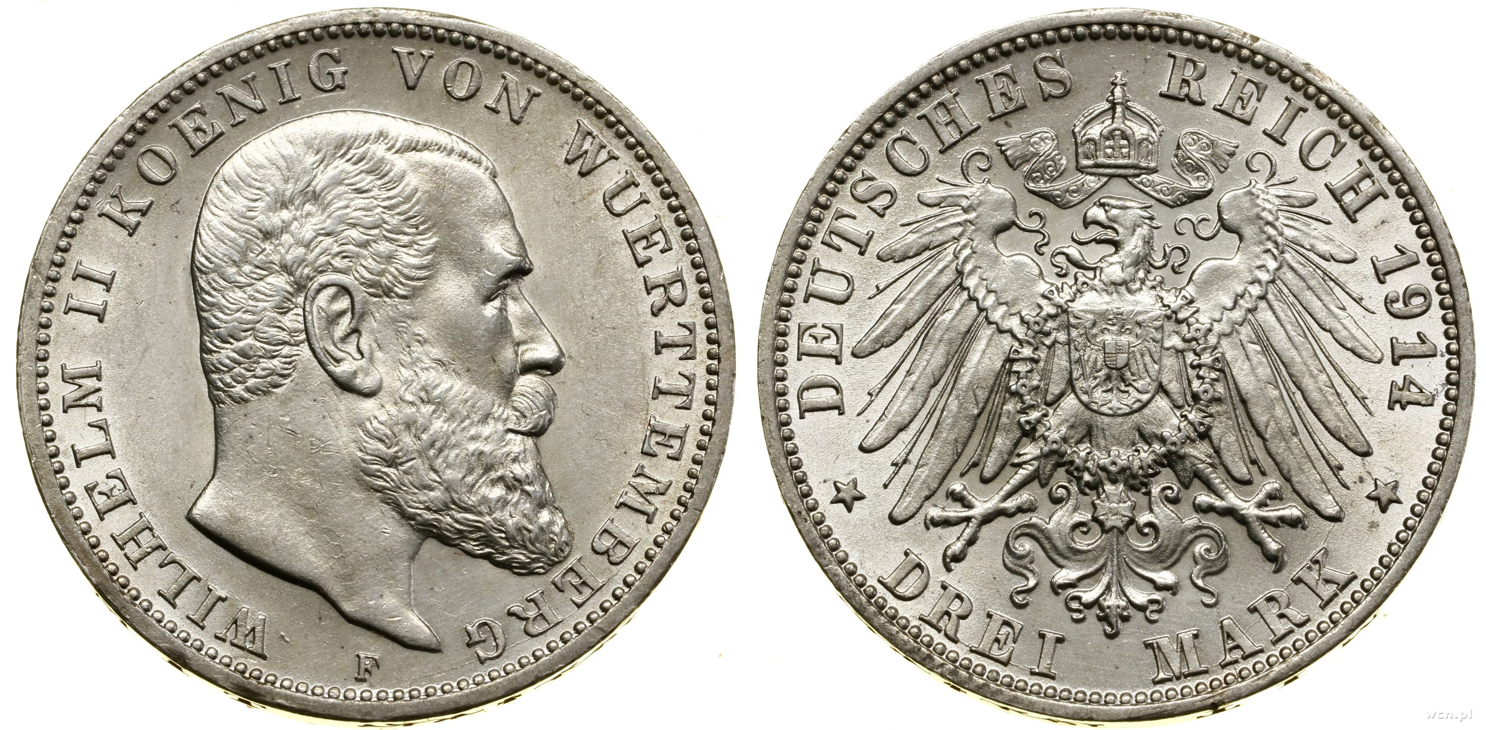 | Opis: | Niemcy - Wirtembergia - Wilhelm II (1891–1918), 3 marki, 1914 F, Stuttgart |