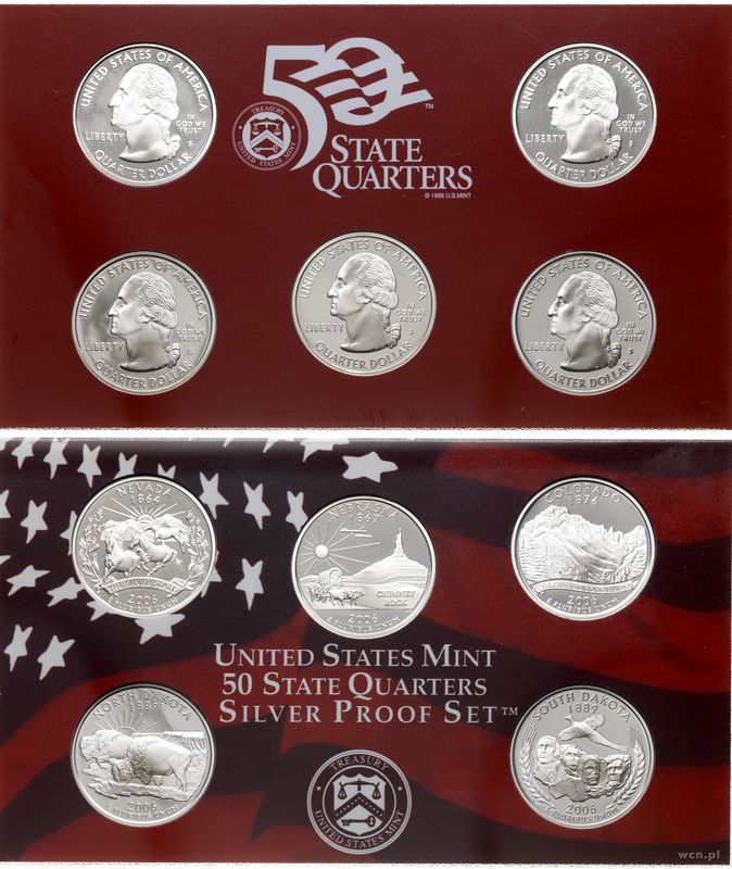 | Opis: | Stany Zjednoczone Ameryki (USA), zestaw rocznikowy, 2006, San Francisco, dwa zestawy po 5 monet, z czego jeden to 5 x 1/4 dolara wybite w srebrze a drugi 1, 5, 10 centów (srebro) i 1/2 dolara (srebro) oraz 1 dolar |
