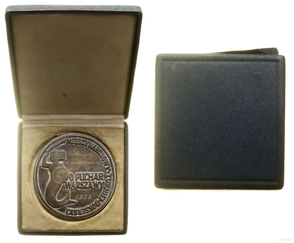 | Opis: | Polska - Polska Rzeczpospolita Ludowa (1952–1989), medal nagrodowy, 1956, Aw: Syrena w lewo, po prawej O PUCHAR / WARSZAWY, wyżej wygrawerowane Za II miejsce / w wadze muszej, niżej wygrawerowane 1956, MIĘDZYNARODOWY • TURNIEJ • BOKSERSKI, Rw: Dwóch bokserów walczących ze sobą, dodatkowo pudełko |