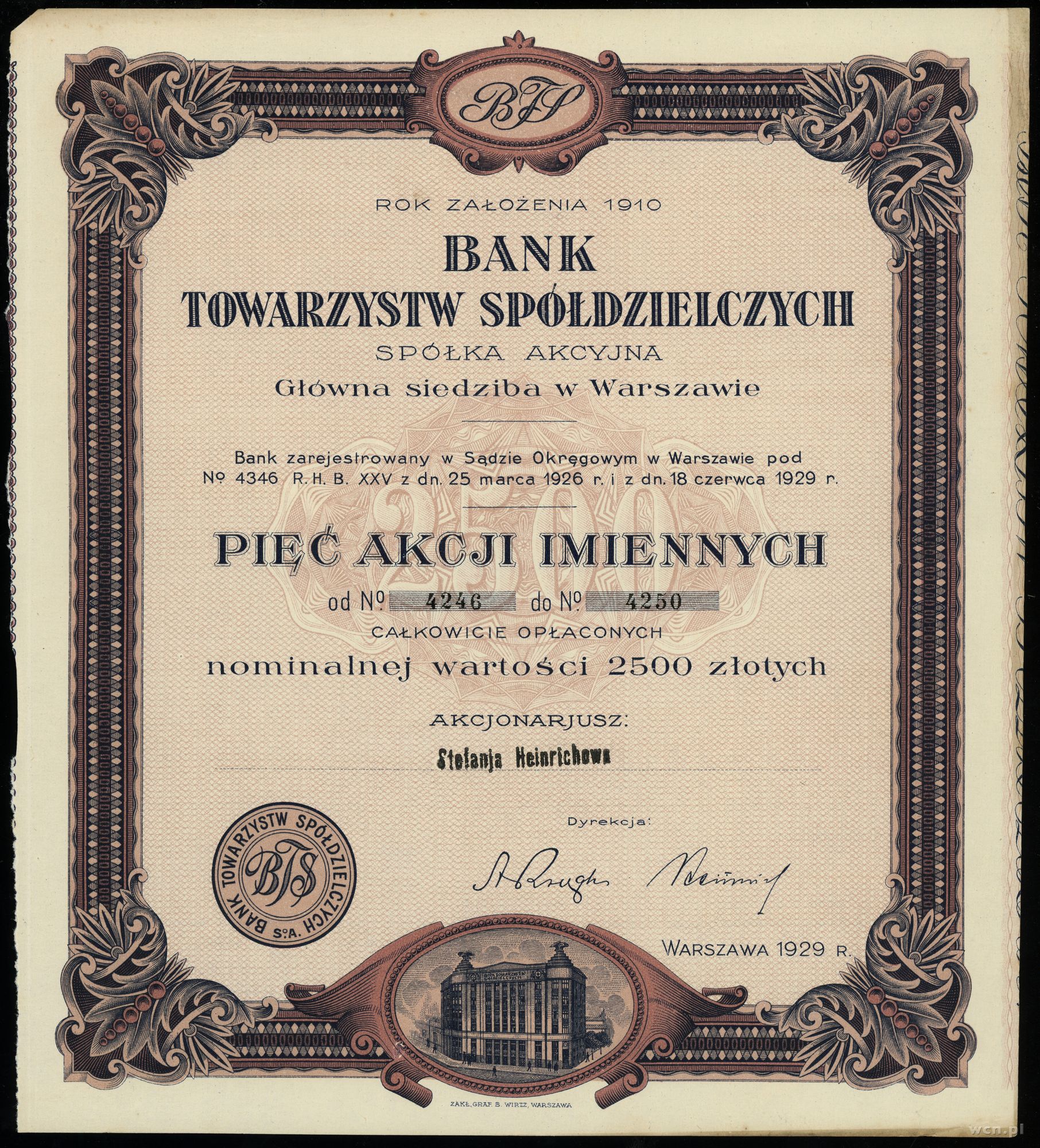 Polska, 5 akcji po 500 złotych = 2.500 złotych, 1929