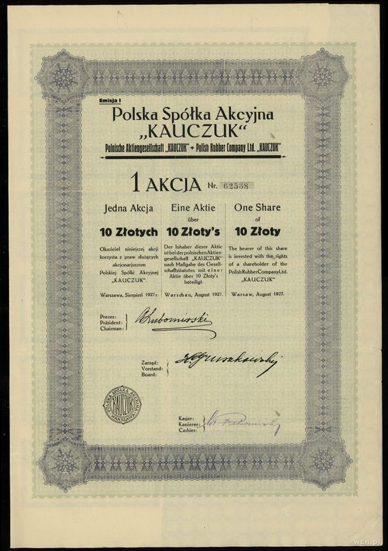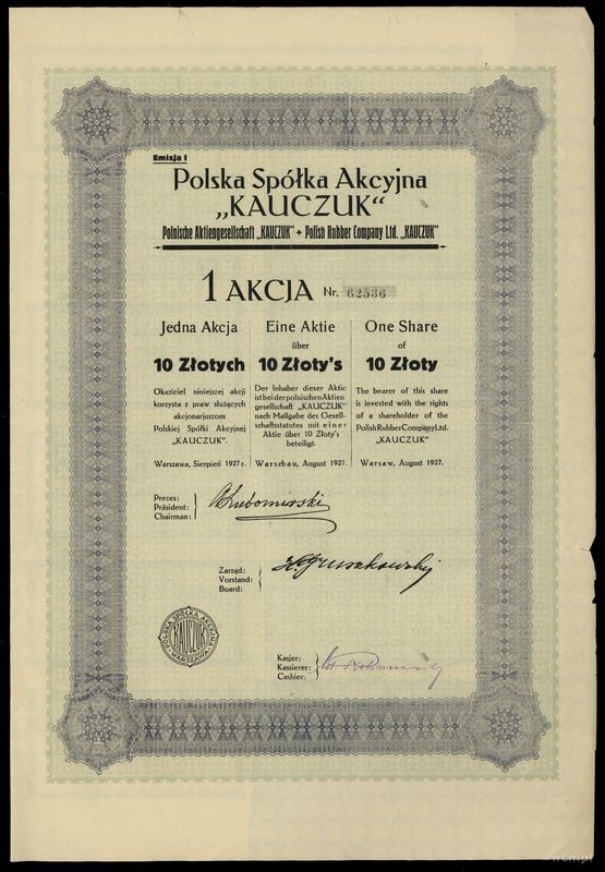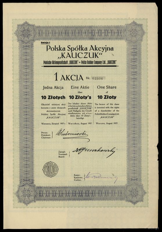| Opis: | Polska - Polska Spółka Akcyjna “KAUCZUK”, zestaw: 4 x 1 akcja na 10 złotych, sierpień 1927, numeracja między 62536 a 62539, akcje z kuponami |