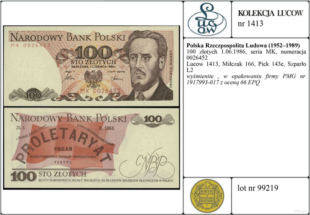 | Opis: | Polska - Polska Rzeczpospolita Ludowa (1952–1989), 100 złotych, 1.06.1986, seria MK, numeracja 0026452 |