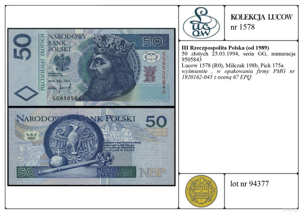 | Opis: | Polska - III Rzeczpospolita Polska (od 1989), 50 złotych, 25.03.1994, seria GG, numeracja 9505843 |