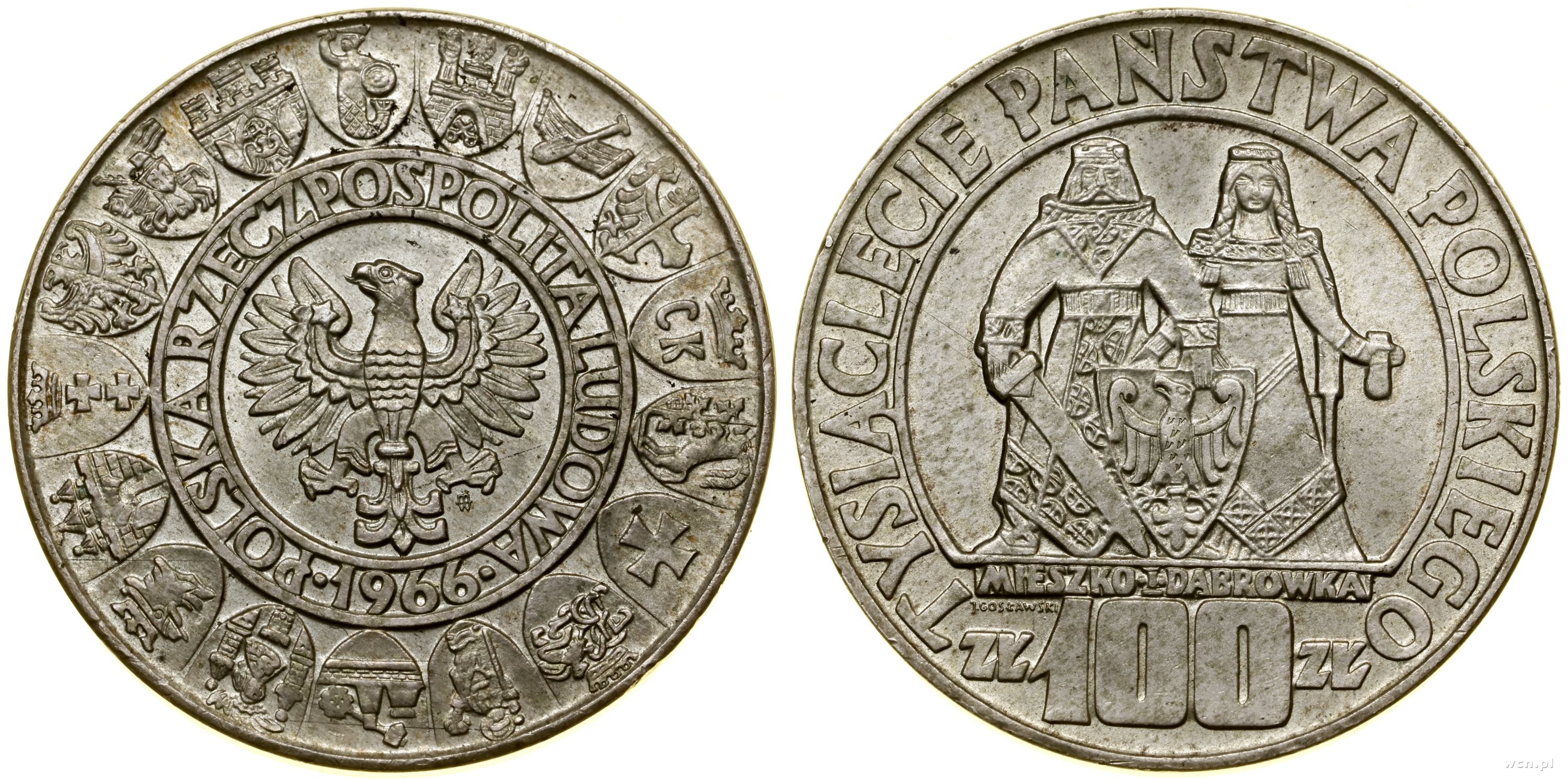 | Opis: | Polska - Polska Rzeczpospolita Ludowa (1952–1989) - monety obiegowe i kolekcjonerskie, 100 złotych, 1966, Warszawa, Tysiąclecie Państwa Polskiego – Mieszko i Dąbrówka |