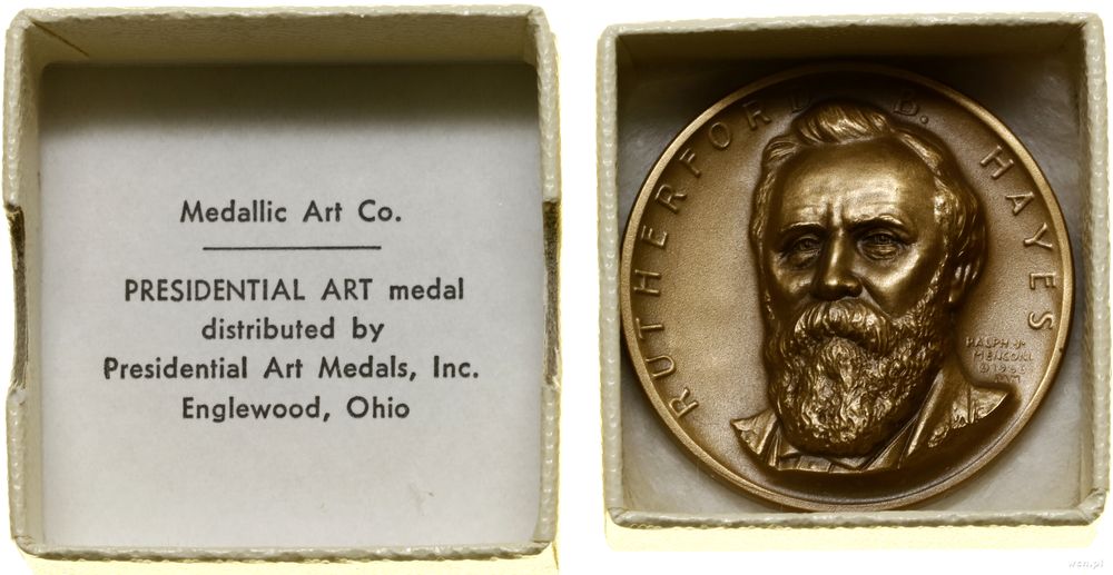 | Opis: | Stany Zjednoczone Ameryki (USA), Prezydenci Stanów Zjednoczonych – Rutherford Birchard Hayes, 1968, Nowy Jork, Aw: Popiersie lekko w lewo, po prawej sygnatura RALPH •J• / MENCONI / © 1965 / PAM, RUTHERFORD B. HAYES, Rw: Orzeł amerykański, u góry 19 TH PRESIDENT, po bokach 1877 - 1881, na dole UNITED STATES OF AMERICA, Obrzeże: Nabite MEDALLIC ART CO NY, projektował i wykonał Ralph J. Menconi, dodatkowo oryginalne pudełko oraz ulotka informacyjna |