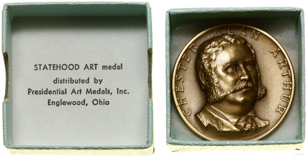 | Opis: | Stany Zjednoczone Ameryki (USA), Prezydenci Stanów Zjednoczonych – Chester Alan Arthur, 1970, Nowy Jork, Aw: Popiersie lekko w prawo, na dole sygnatura PAN - RALPH •J• MENCONI © 1970, CHESTER ALAN ARTHUR, Rw: Orzeł amerykański, u góry 21 ST PRESIDENT, po bokach 1881 - 1885, na dole UNITED STATES OF AMERICA, Obrzeże: Nabite MEDALLIC ART CO NY, projektował i wykonał Ralph J. Menconi, dodatkowo oryginalne pudełko oraz ulotka informacyjna |