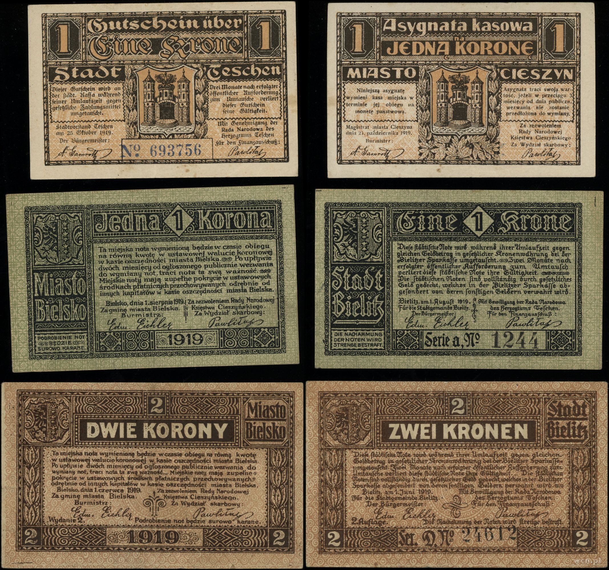 1) 1 korona 1.08.1919 Galicja, Bielsko - Gmina Miasta 2) ... | II-/III+ |