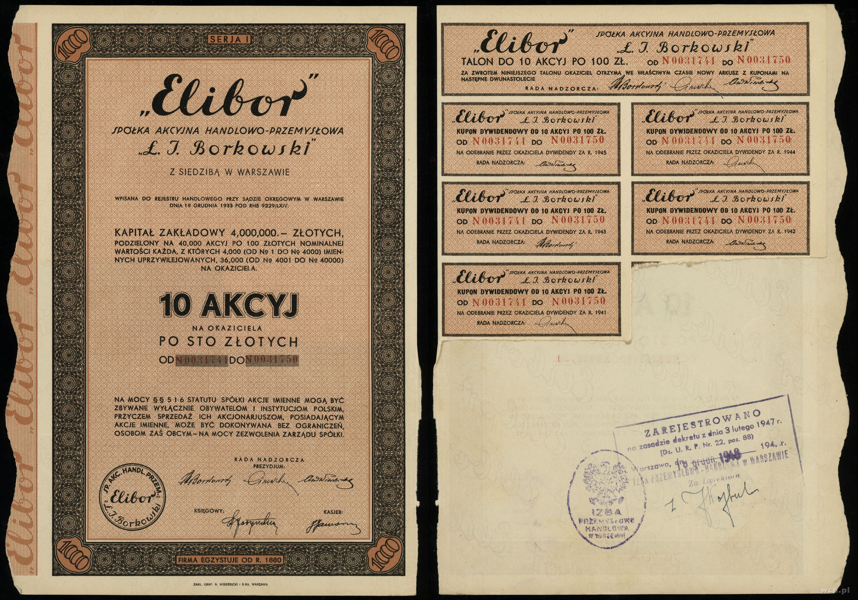III emisja, numeracja 00948, z talonem i 6 kuponami | I- |