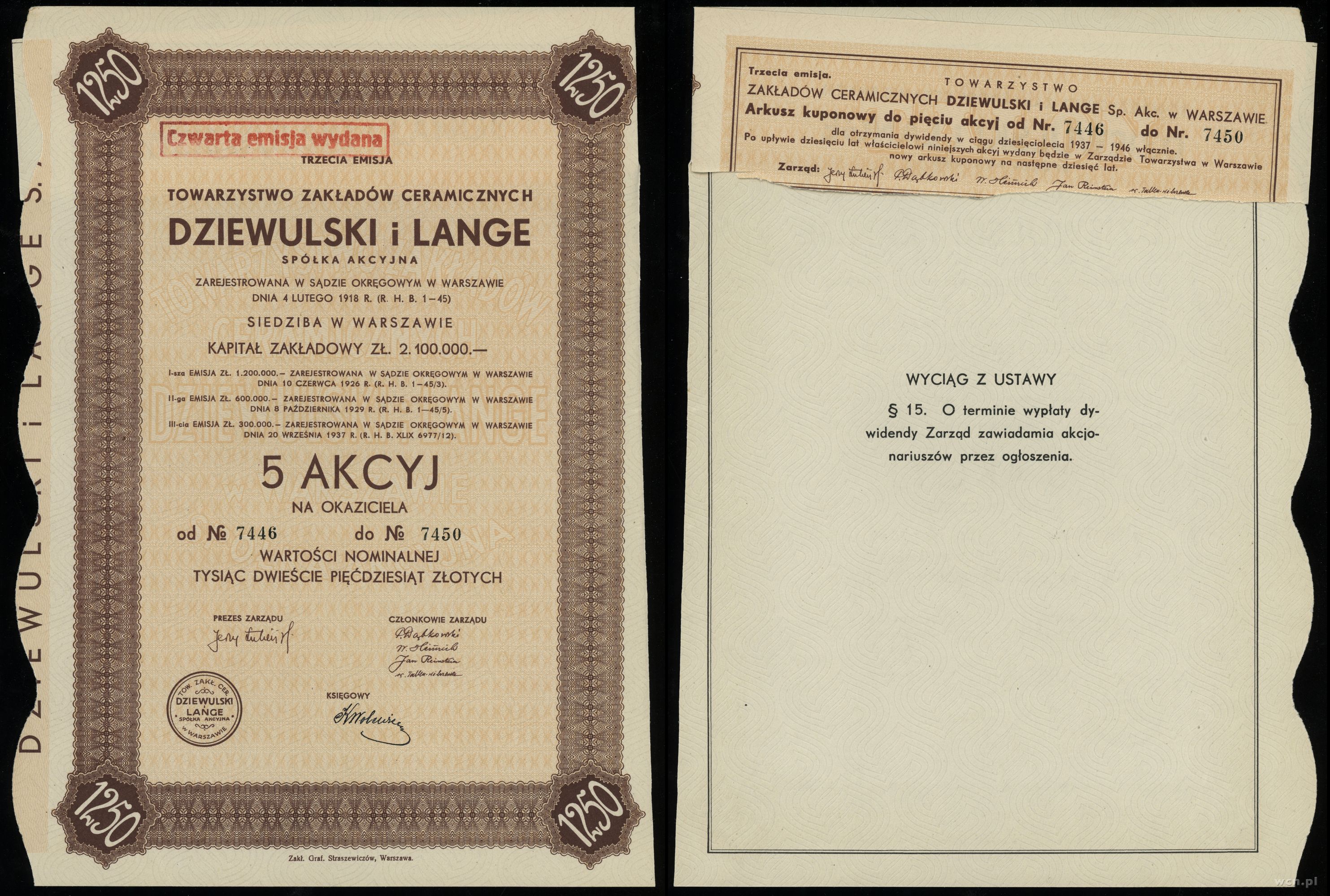 Polska, 5 akcji po 250 złotych = 1.250 złotych, 1937