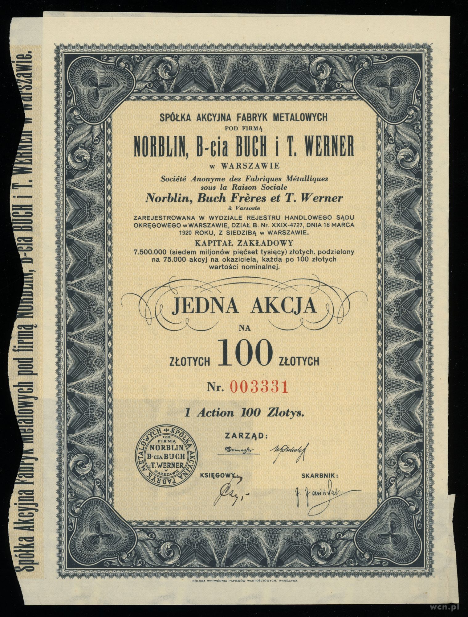 1) 1 akcja na 100 złotych [Norblin, B-cia Buch i T. Werne... | I-/II- |
