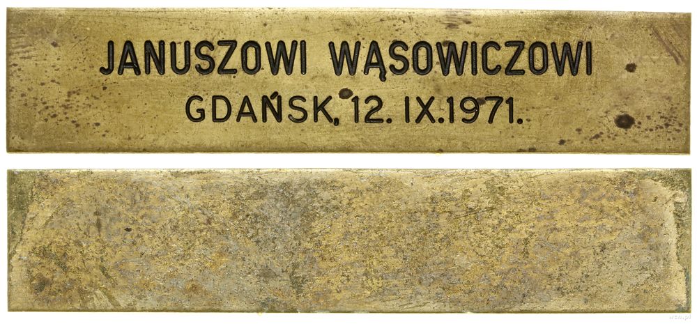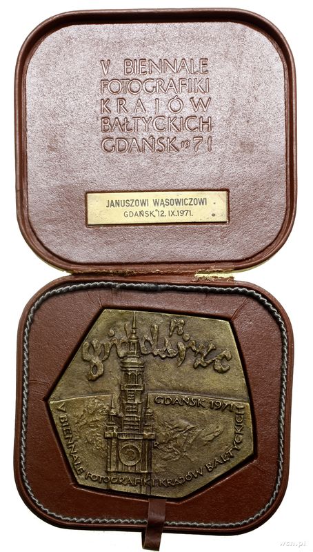 | Opis: | Polska - Polska Rzeczpospolita Ludowa (1952–1989), medal nagrodowy, 1971, Aw: Wieża ratusza w Gdańsku, po prawej GDAŃSK 1971, V BIENNALE FOTOGRAFIKI KRAJÓW BAŁTYCKICH, Rw: X LAT / DZIAŁALNOŚCI / DLA ROZWOJU / FOTOGRAFIKI / KRAJÓW / BAŁTYCKICH, niżej gałązka, niżej loga ZPAF i GTPS, ZWIĄZEK POLSKICH ARTYSTÓW FOTOGRAFIKÓW, dodatkowo oryginalne pudełko z plakietką z napisem JANUSZOWI WĄSOWICZOWI / GDAŃSK, 12.IX.1971. |