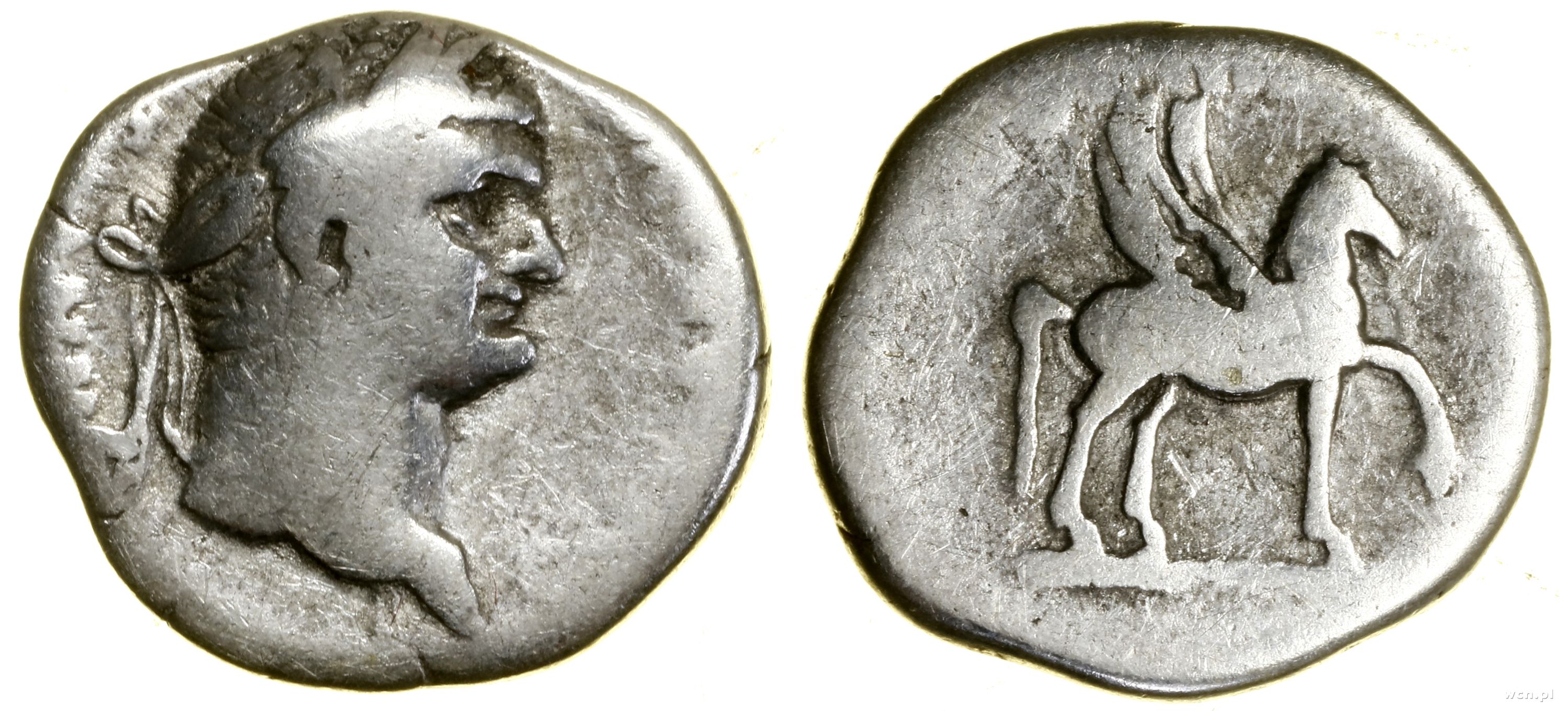 Aw: Głowa cezara w wieńcu w prawo, legenda, Rw: Pegaz w p...