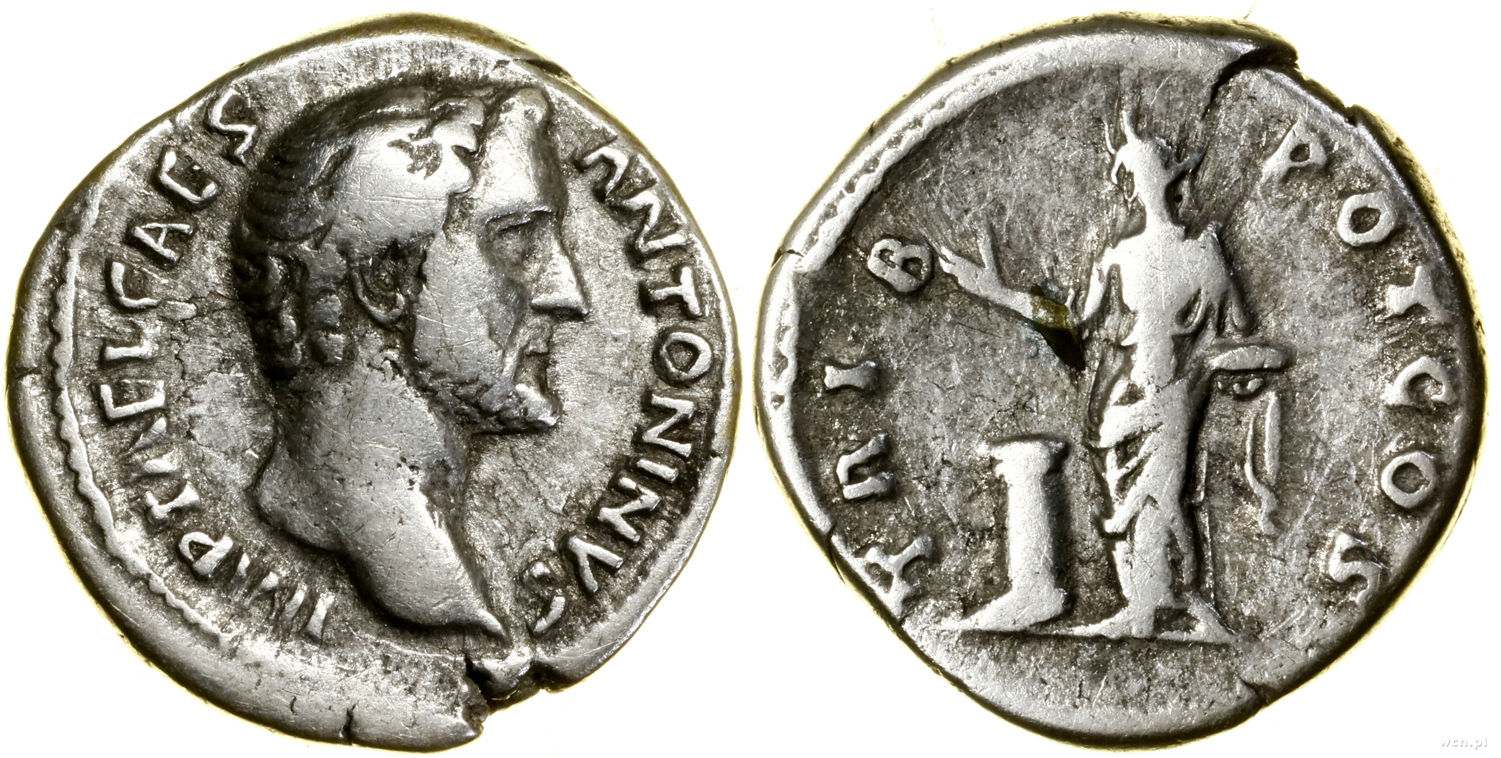 Aw: Głowa cezara w prawo, IMP T AEL CAES ANTONINVS, Rw: P...