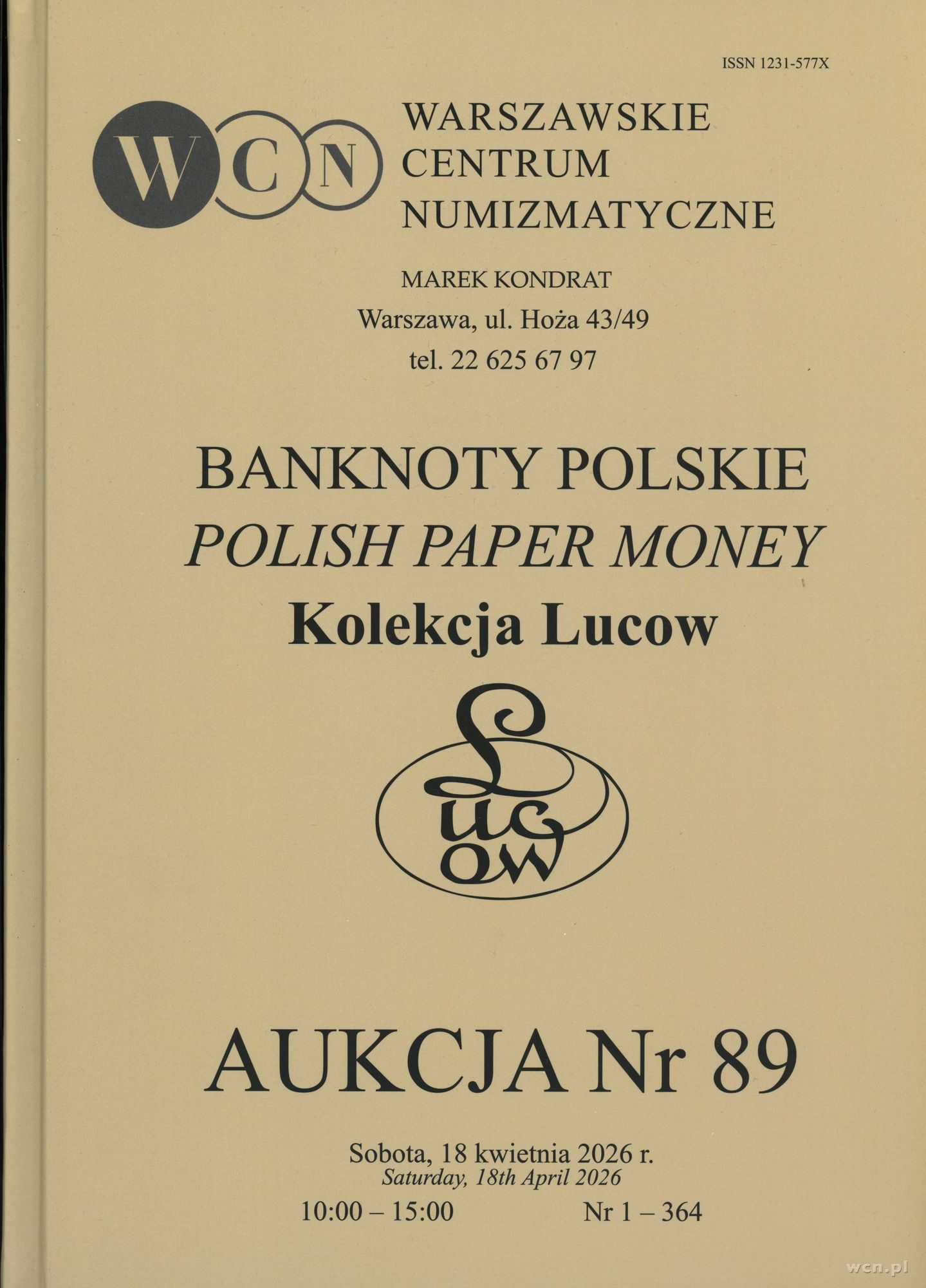 literatura numizmatyczna, Katalog aukcji WCN nr 89, Banknoty Polskie. Kolekcja Lucow, 18.04.2026