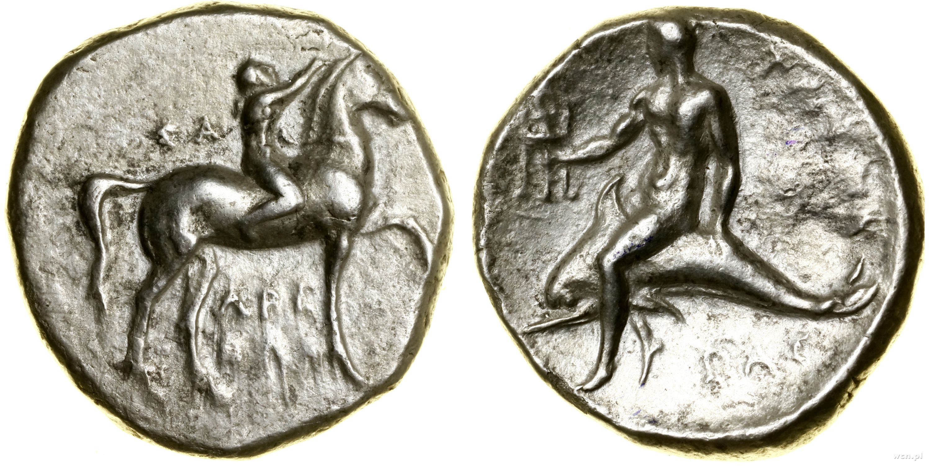 | Opis: | Grecja i posthellenistyczne - Kalabria - Tarent, nomos, (280–272 pne), Aw: Młodzieniec na koniu w lewo, powyżej ΣA, poniżej AΠE / ΘΩN; Rw: Taras jadący na delfinie w lewo, trzymający trójnóg, z prawej ΤΑΡΑΣ, poniżej CAΣ |