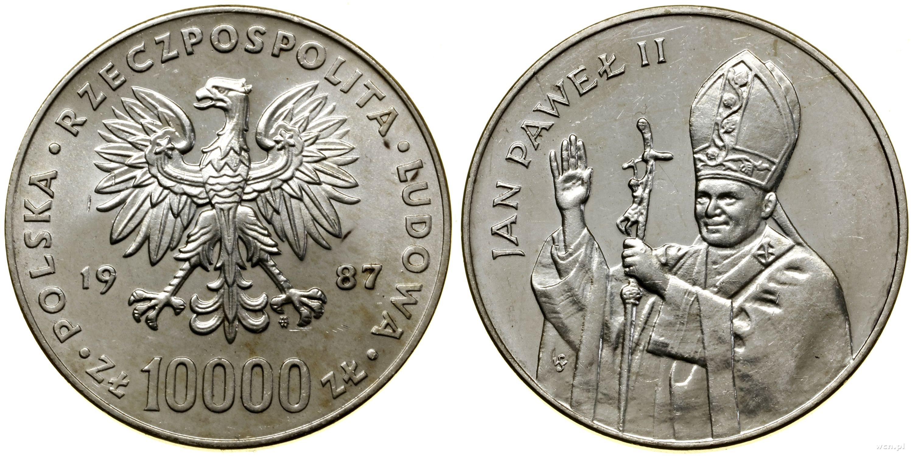 | Opis: | Polska - Polska Rzeczpospolita Ludowa (1952–1989) - monety obiegowe i kolekcjonerskie, 10.000 złotych, 1987, Warszawa, Jan Paweł II (popiersie 3/4 w lewo z krzyżem), stempel zwykły |