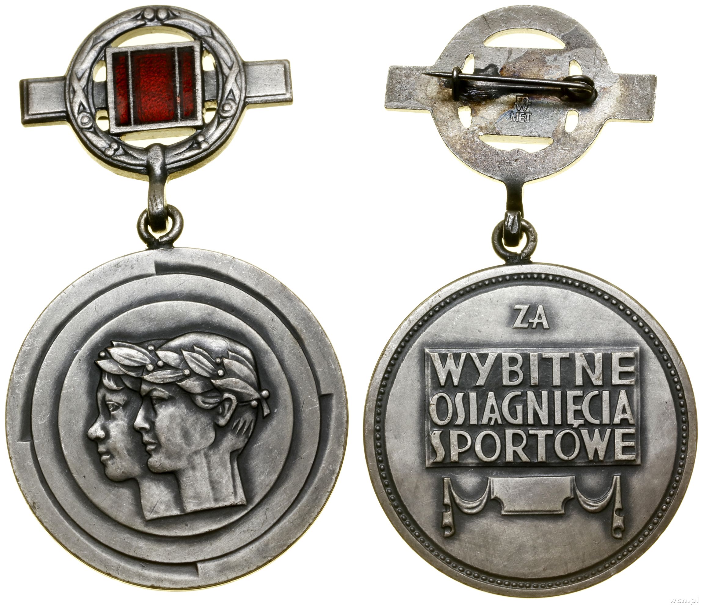 | Opis: | Polska - Polska Rzeczpospolita Ludowa (1952–1989), Medal za Wybitne Osiągnięcia Sportowe, 1974, Warszawa, Dwie głowy w prawo, w wieńcach laurowych, na stronie odwrotnej ZA / WYBITNE / OSIĄGNIĘCIA / SPORTOWE, niżej kapitel, odznaka jednoczęściowa, mocowana na przywieszkę |