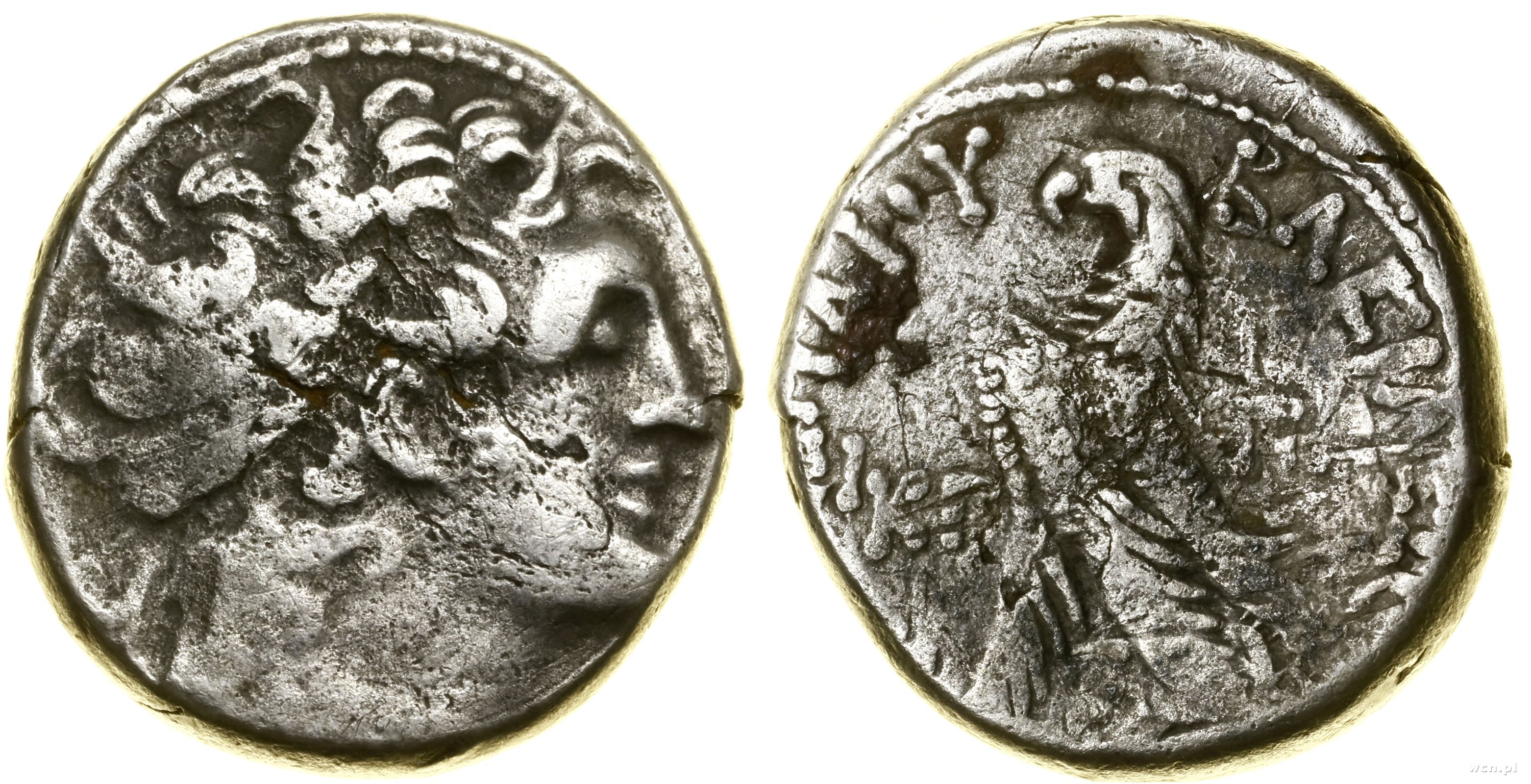| Opis: | Grecja i posthellenistyczne - Egipt - Kleopatra III i Ptolemeusz X Aleksander (107–101 pne), tetradrachma, rok 26 (89/88 pne), Aw: Głowa króla w prawo, Rw: Orzeł na wiązce piorunów w lewo, w lewym polu data, w prawym ΠΑ, w otoku legenda |