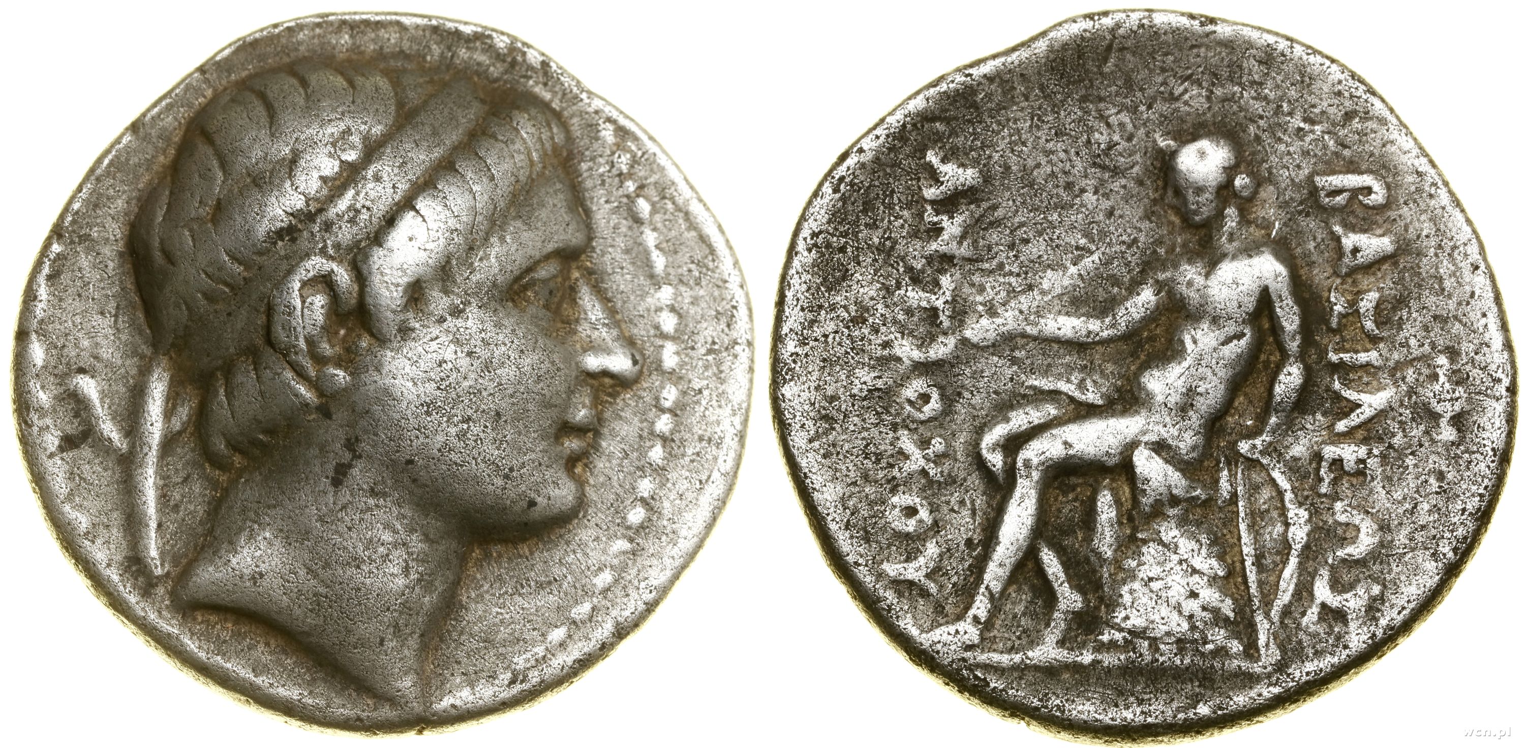| Opis: | Grecja i posthellenistyczne - Syria - Antioch II Theos (261–246 pne), tetradrachma, (ok. 261–246 pne), mennica w Syrii lub Mezopotamii, Aw: Głowa władcy w diademie w prawo; Rw: Apollo siedzący w lewo na Omfalosie (kamień uważany przez starożytnych za pępek świata), opierający lewą ręke o łuk, w prawej trzymający strzałę, ΒΑΣΙΛΕΩΣ / ΑΝΤΙΟΧΟΥ, po prawej Φ |